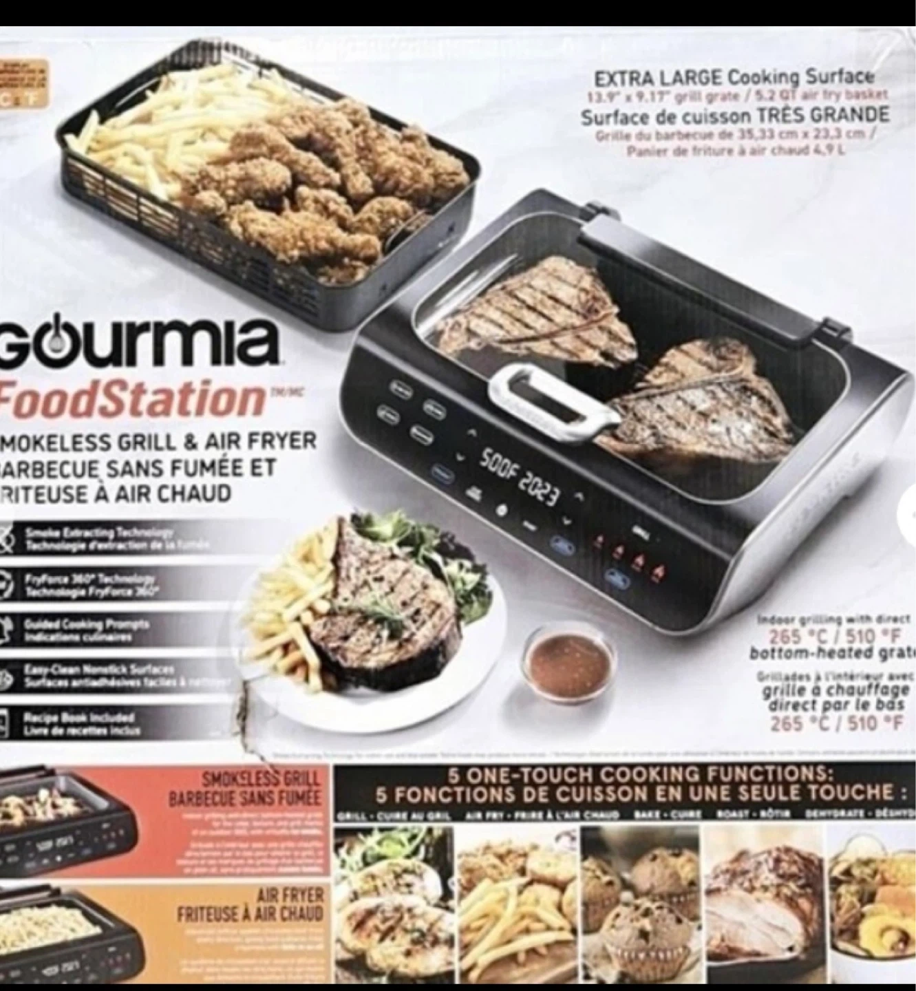 This Gourmia FoodStation grills, air fries, roasts, bakes, and dehydrates with smoke extracting technology for virtually no smoke. It features a bottom-heated grill grate up to 510°F and a 4.9 L air fry basket. Includes removable grill grate, air fry basket, and drip tray. Please contact if the price and pick up location works for you. Pick up is closer to mayfield and Kennedy - border of Brampton and Caledon