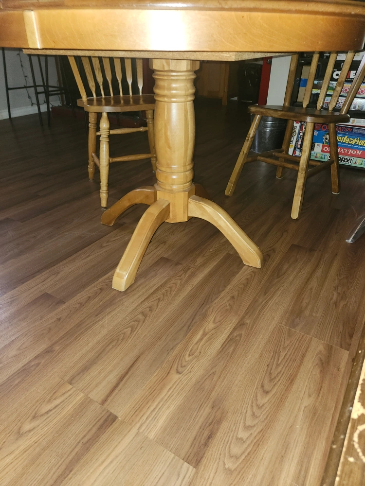 Selling a round wooden dining table with a pedestal base. and 2 chairs. It's in good condition and would be perfect for a smaller dining space or kitchen. It comes as is!