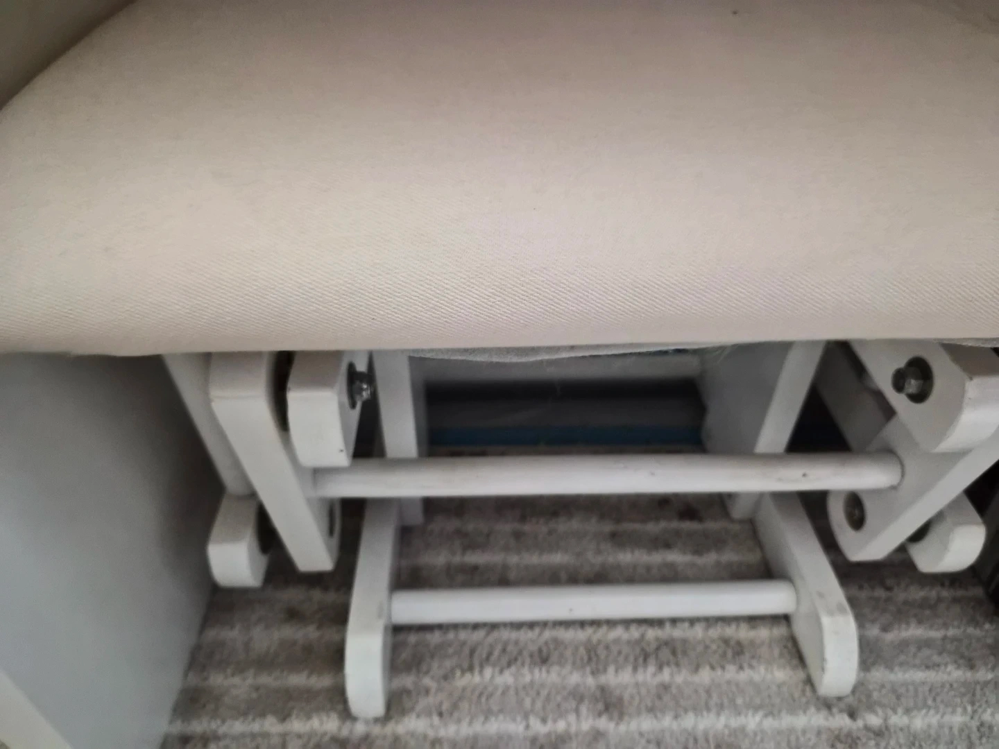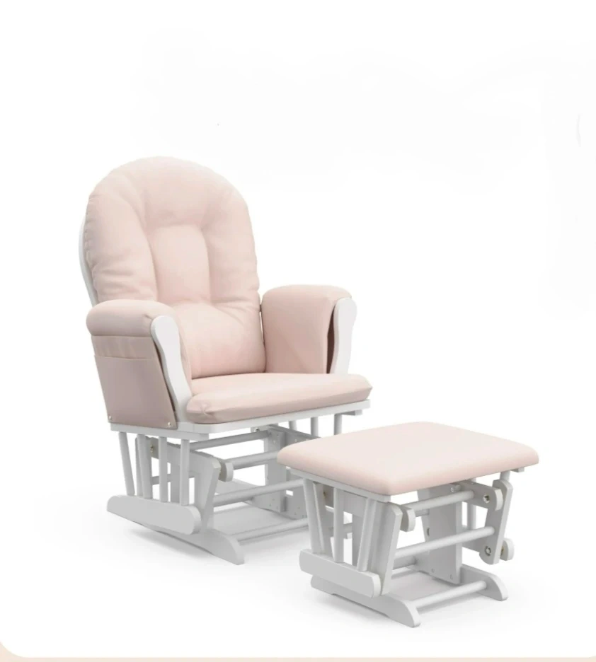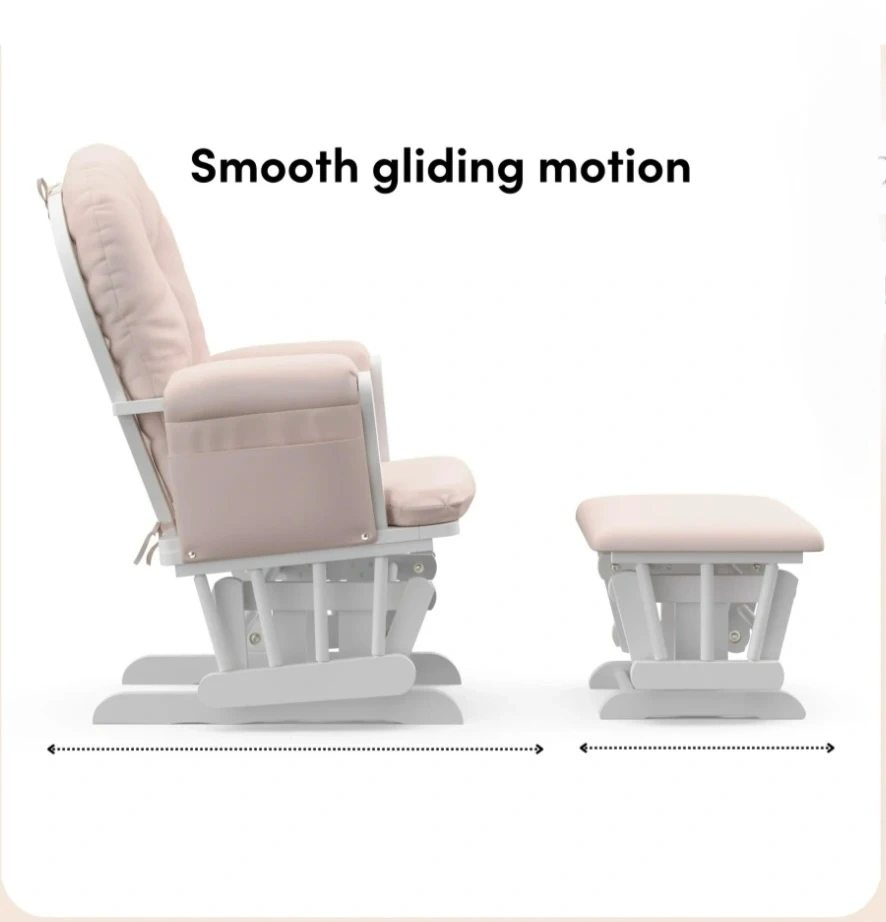 This glider chair and ottoman set comes in a soft pink upholstered finish with a white wooden frame. It features a smooth gliding motion for comfort. The chair includes side pockets for storage. It's designed for nurseries or relaxation spaces.