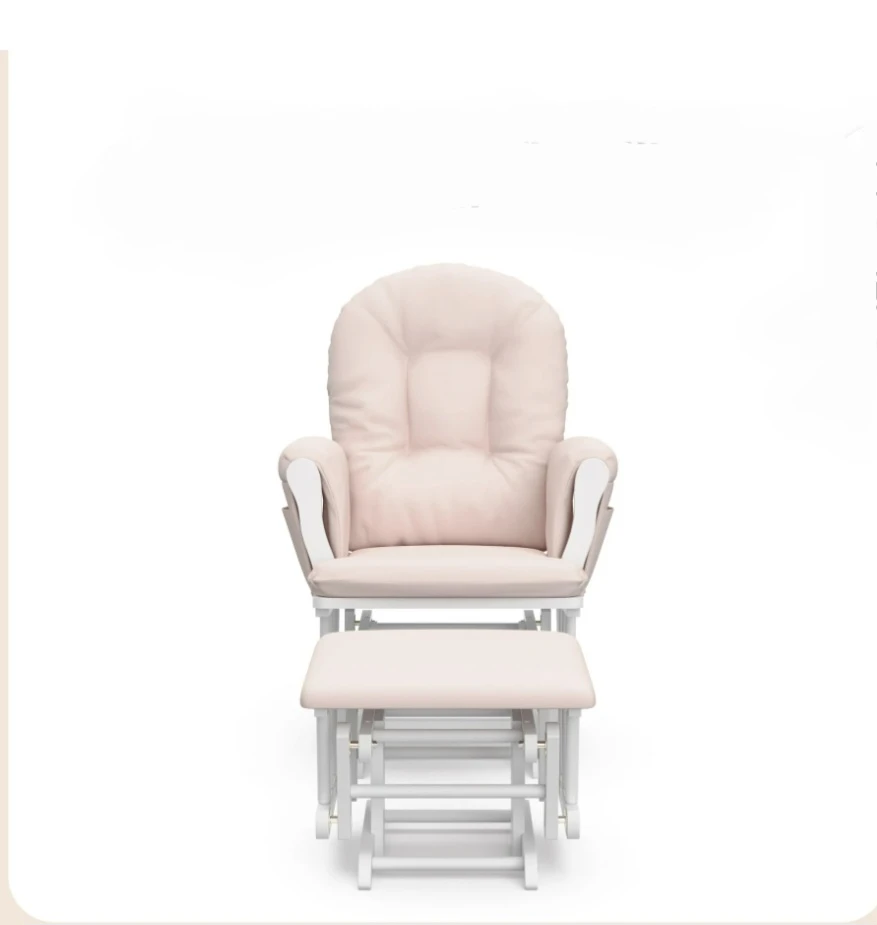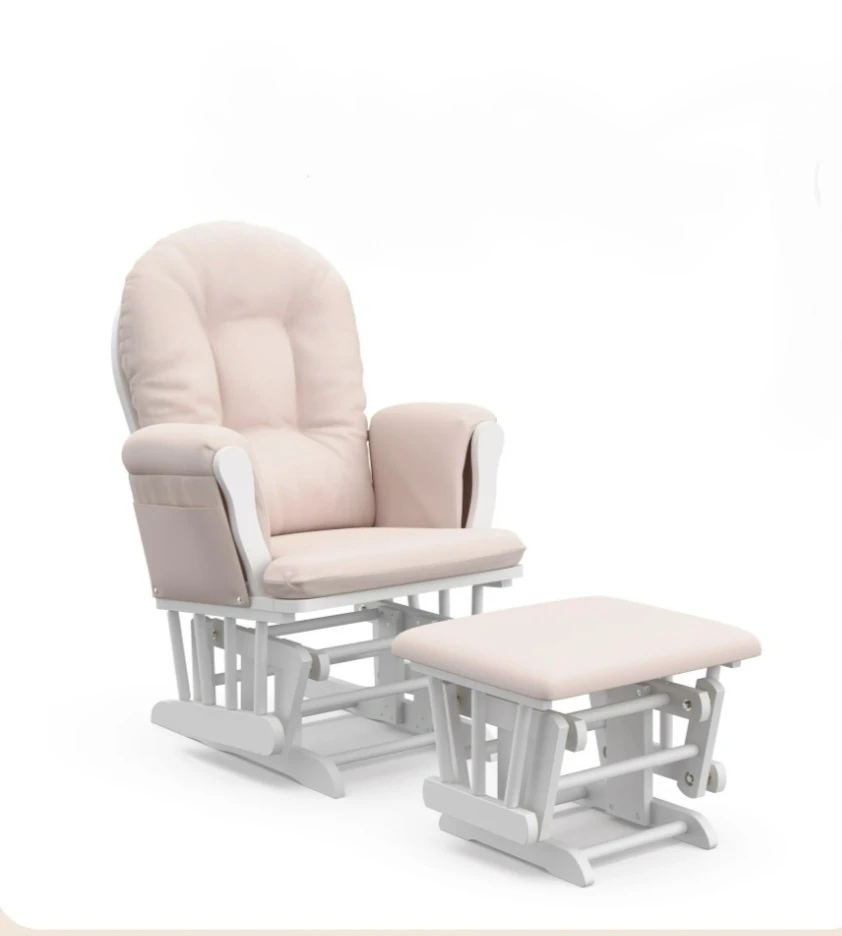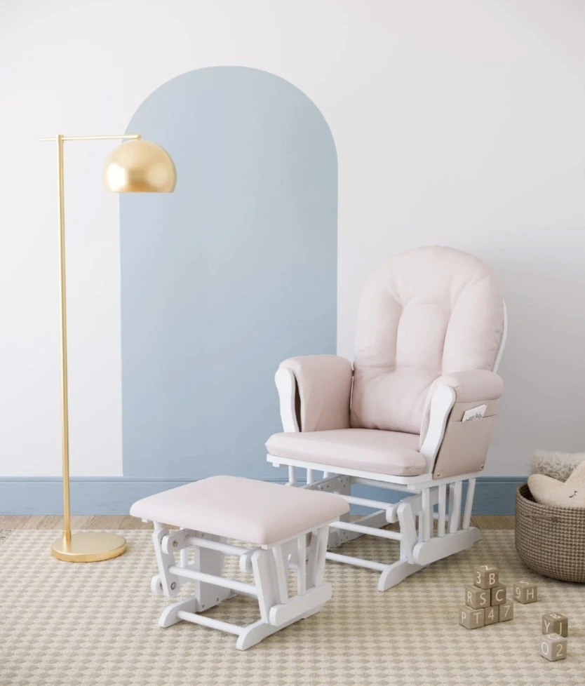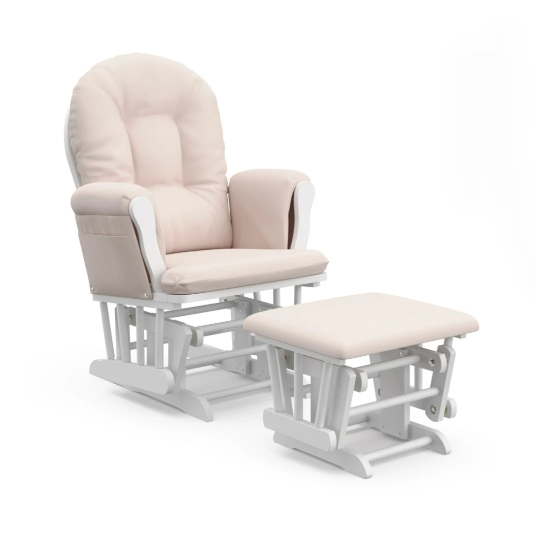 This glider chair and ottoman set comes in a soft pink upholstered finish with a white wooden frame. It features a smooth gliding motion for comfort. The chair includes side pockets for storage. It's designed for nurseries or relaxation spaces.
