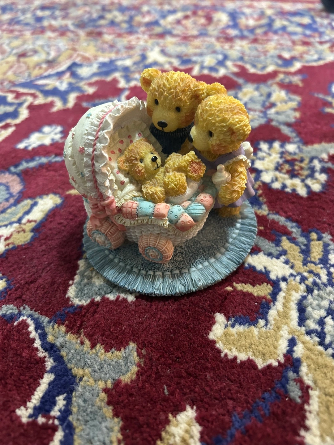 Figurine featuring three teddy bears. The teddy bears are gathered around a baby bear in a stroller. The figurine has a blue base. A perfect item to add a bit of calm to a nursery or shelf.