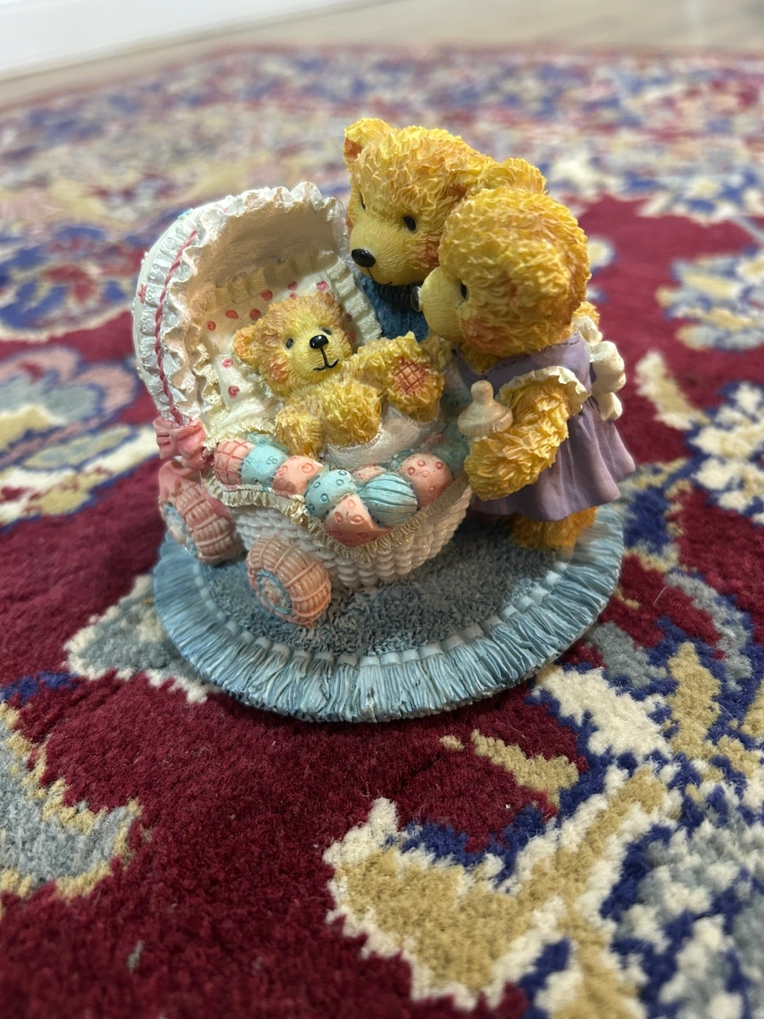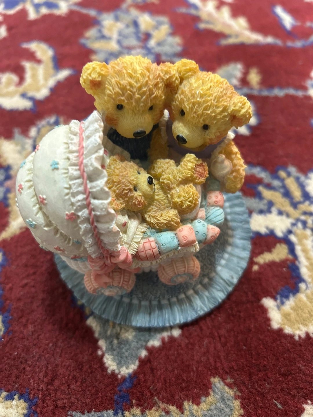 Figurine featuring three teddy bears. The teddy bears are gathered around a baby bear in a stroller. The figurine has a blue base. A perfect item to add a bit of calm to a nursery or shelf.