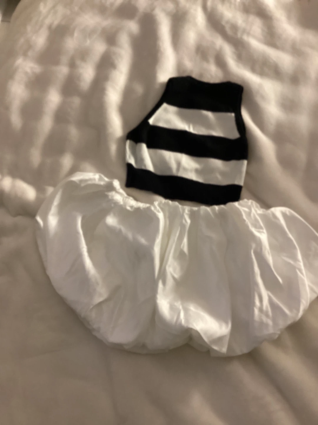 This adorable set features a black and white striped sleeveless crop top paired with a voluminous white bubble skirt. It's a fun and stylish outfit for any occasion. Great for summer days or dress-up fun!