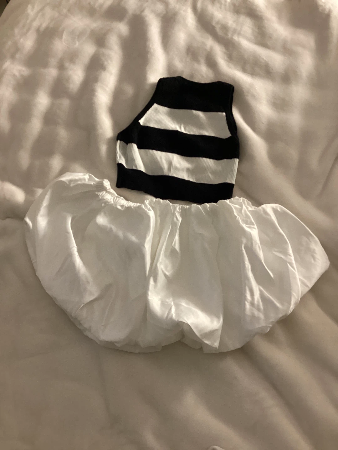 This adorable set features a black and white striped sleeveless crop top paired with a voluminous white bubble skirt. It's a fun and stylish outfit for any occasion. Great for summer days or dress-up fun!