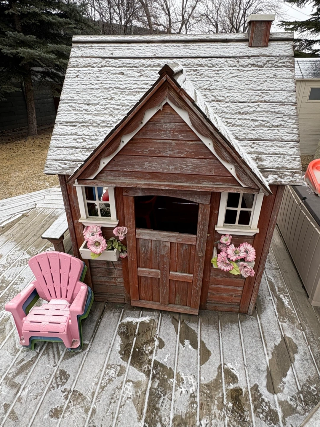 This rustic wooden playhouse is perfect for hours of imaginative fun! It's complete with a play kitchen,bbq, flowers, electric doorbell, pink, blue and green chairs and bench. Kids will love this charming addition to their backyard! A couple boards will need to be re-secured and new batteries for the electronic doorbell. A coat of paint would make it brand new again.