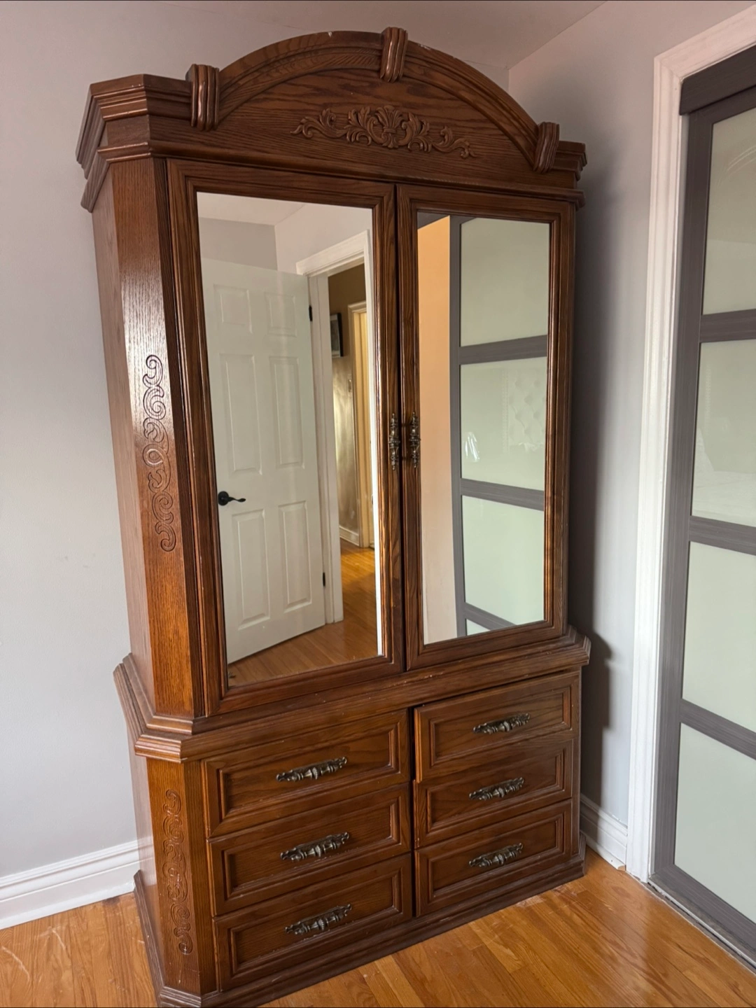 Selling a beautiful wooden armoire, perfect for adding storage and style to any room! It features mirrored doors and several drawers for ample storage space. The wood has a lovely warm tone and the detailing adds a touch of elegance to the piece