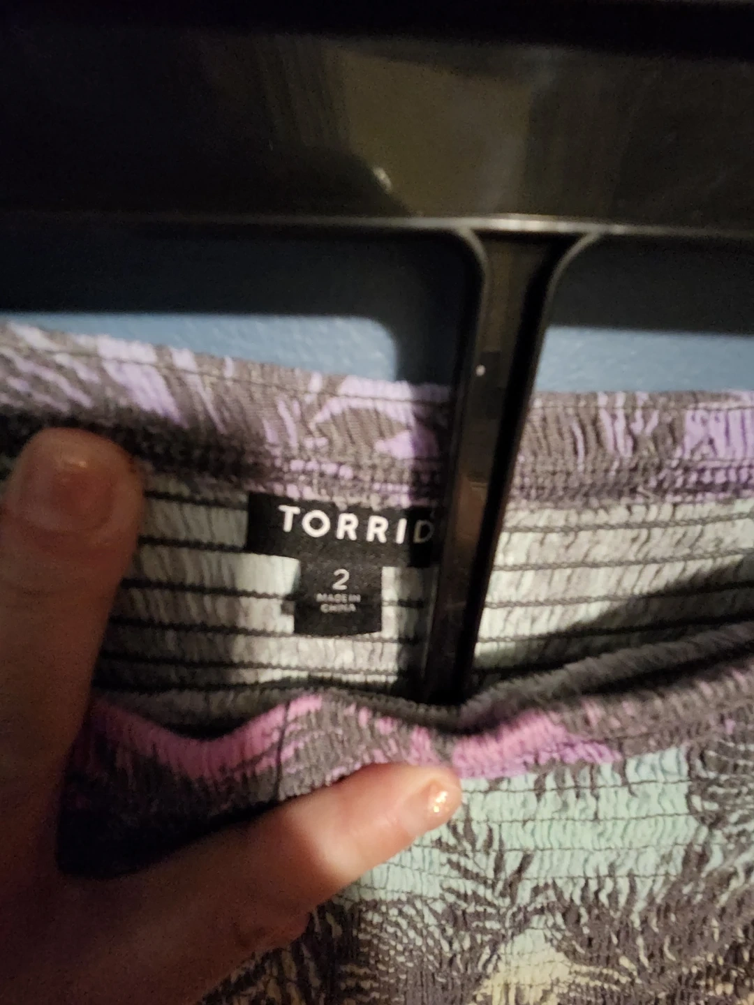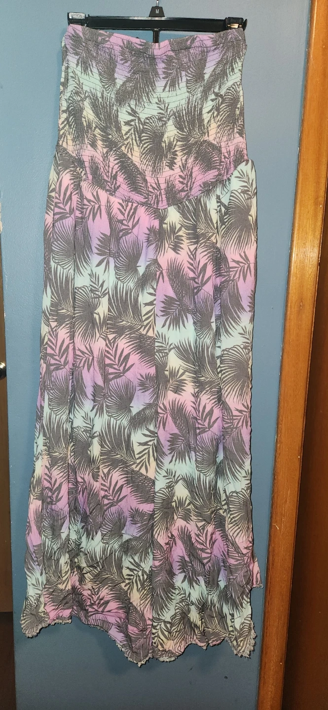This Torrid strapless maxi dress features a vibrant palm leaf print. It's a size 2 with a smocked bodice for a comfortable fit. The pastel colour palette makes it perfect for warm weather occasions!
