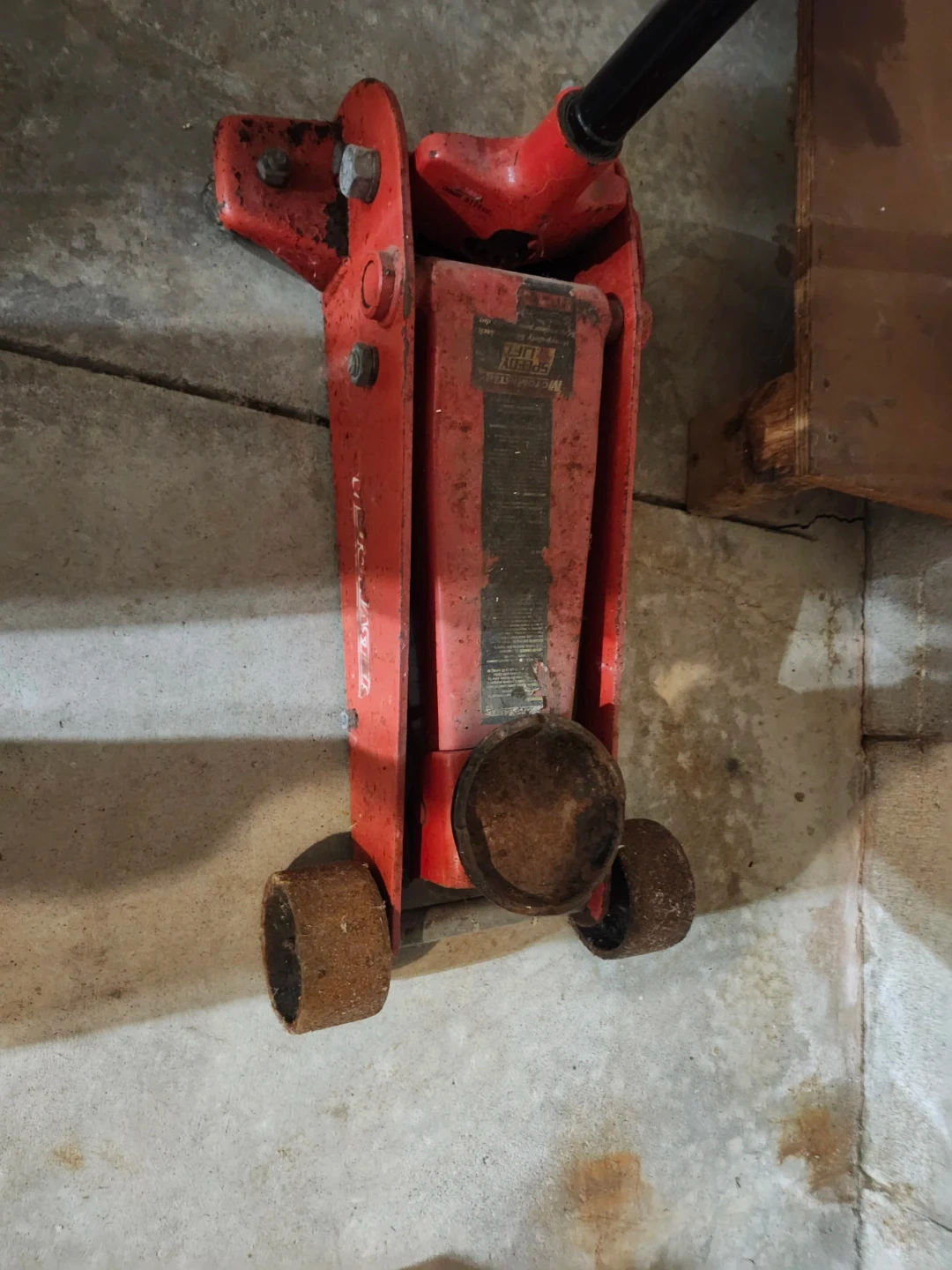This is a red Metal Star Speedy Lift hydraulic floor jack. It has a black handle and metal wheels. It's a sturdy piece of equipment.