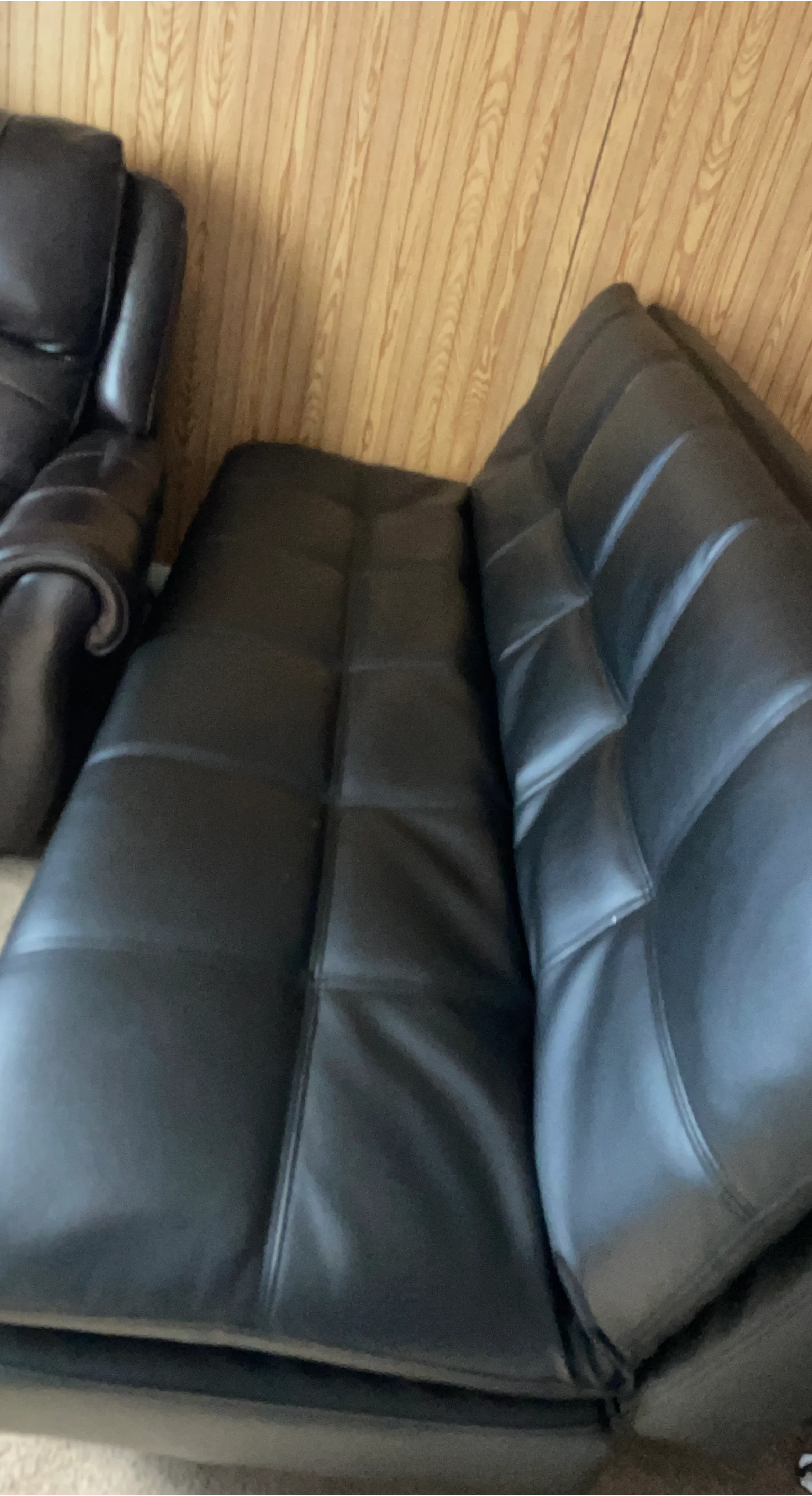 Black faux leather loveseat sofa with tufted cushions. Its dimensions are approximately 50 inches wide and 30 inches deep. This compact sofa fits well in smaller spaces. It's a simple seating solution for any room!