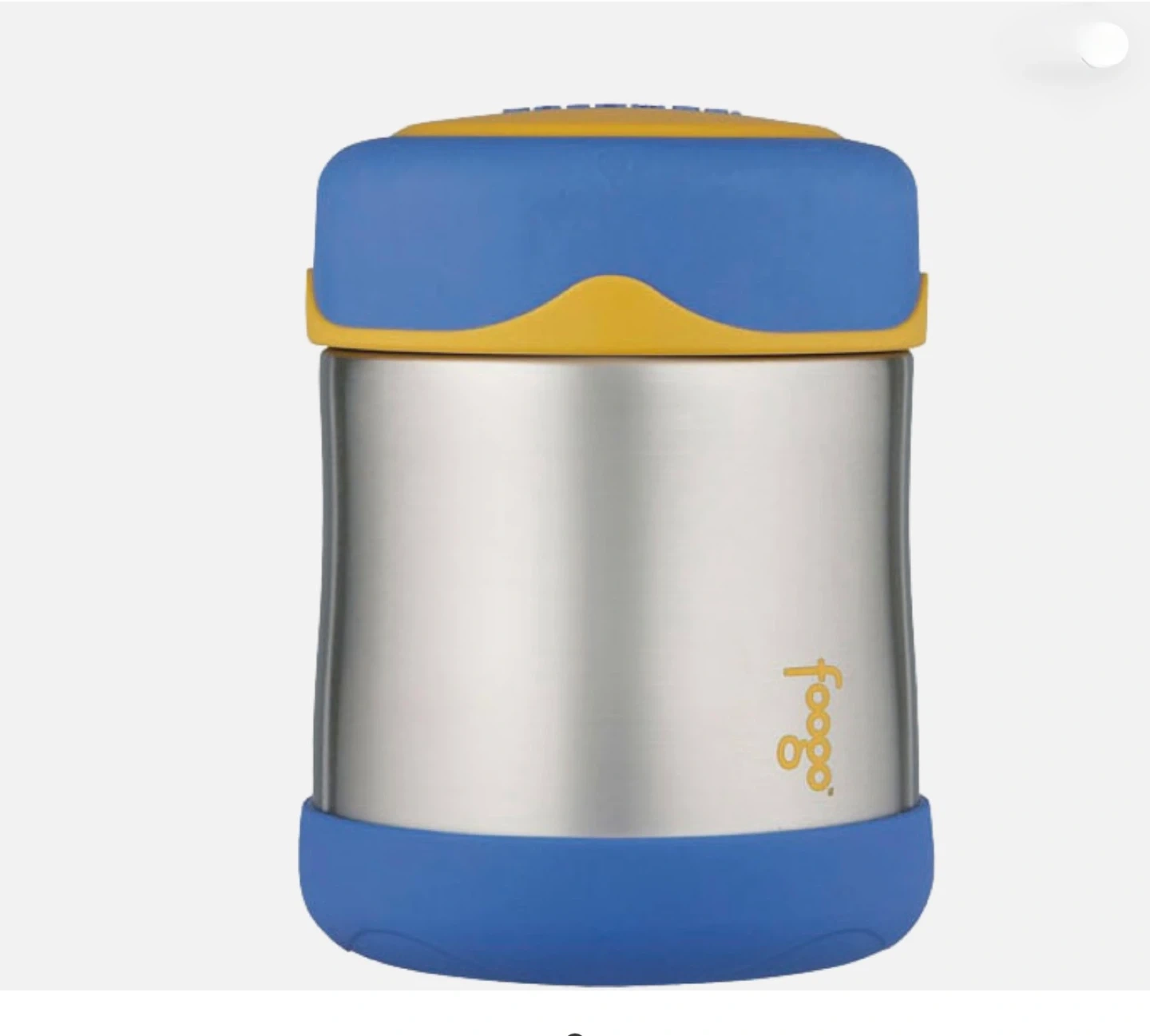 Used but in great condition. Thermos Foogo insulated food jar keeps food hot or cold. It's made with durable stainless steel and features a blue and yellow design. The dimensions are 12.5cm tall and 8.99cm wide, 290ml capacity. 2 available - $10 each