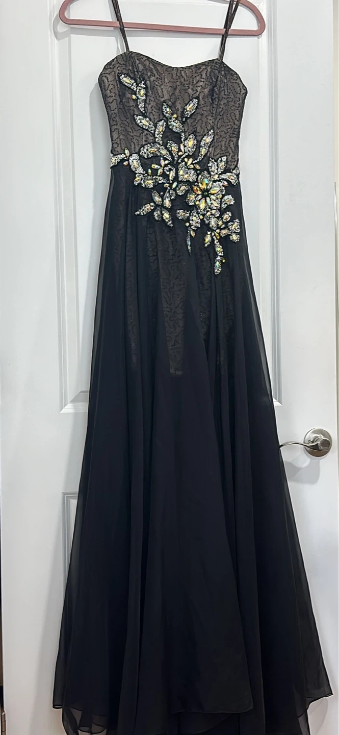 Beautiful black prom dress featuring a beaded bodice and a flowing chiffon skirt. Spaghetti straps and a sweetheart neckline. This gown's designed for formal events!