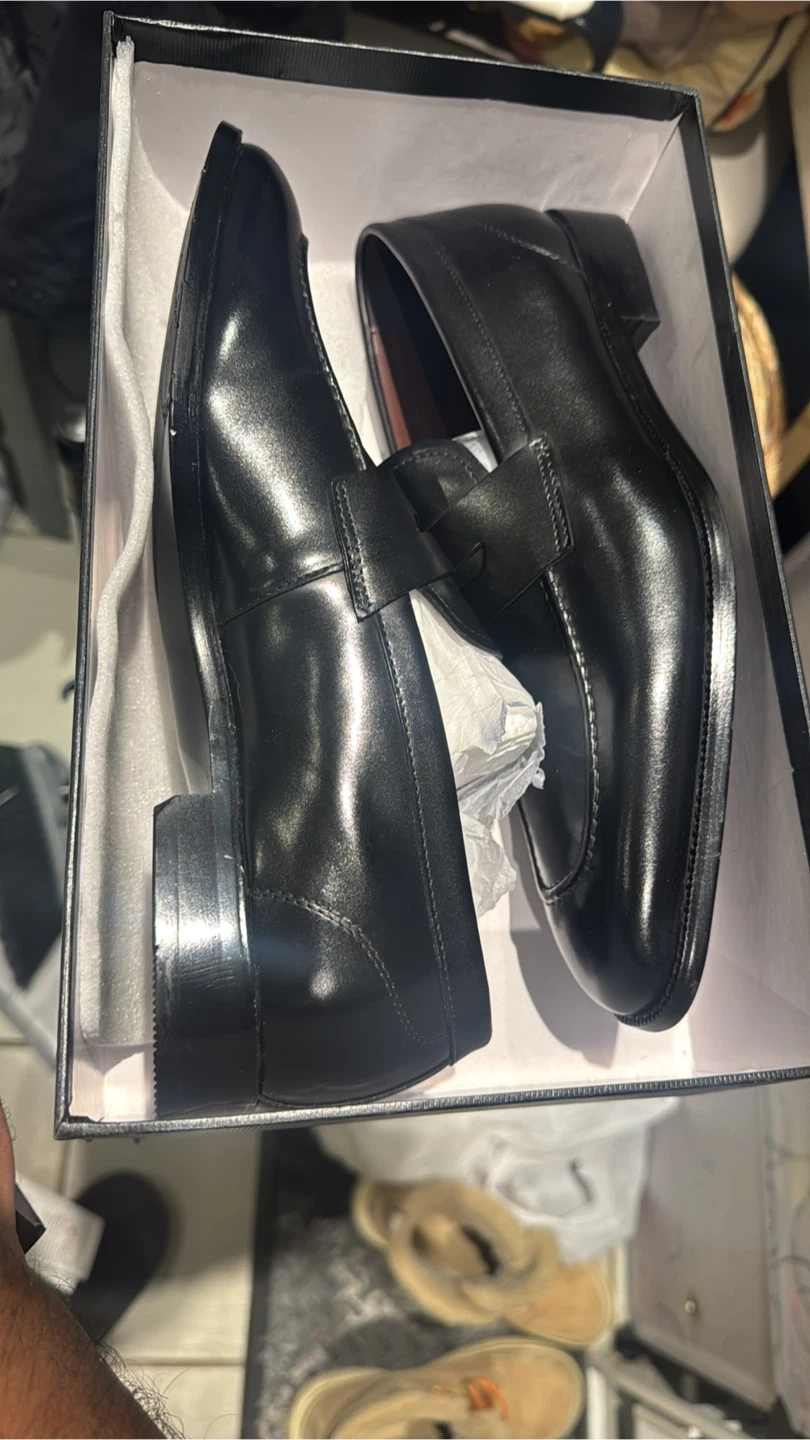 Classic black leather loafers, perfect for any dressy occasion. These shoes are a size 10. They feature a durable sole for comfort and long wear. A great addition to your footwear collection!
