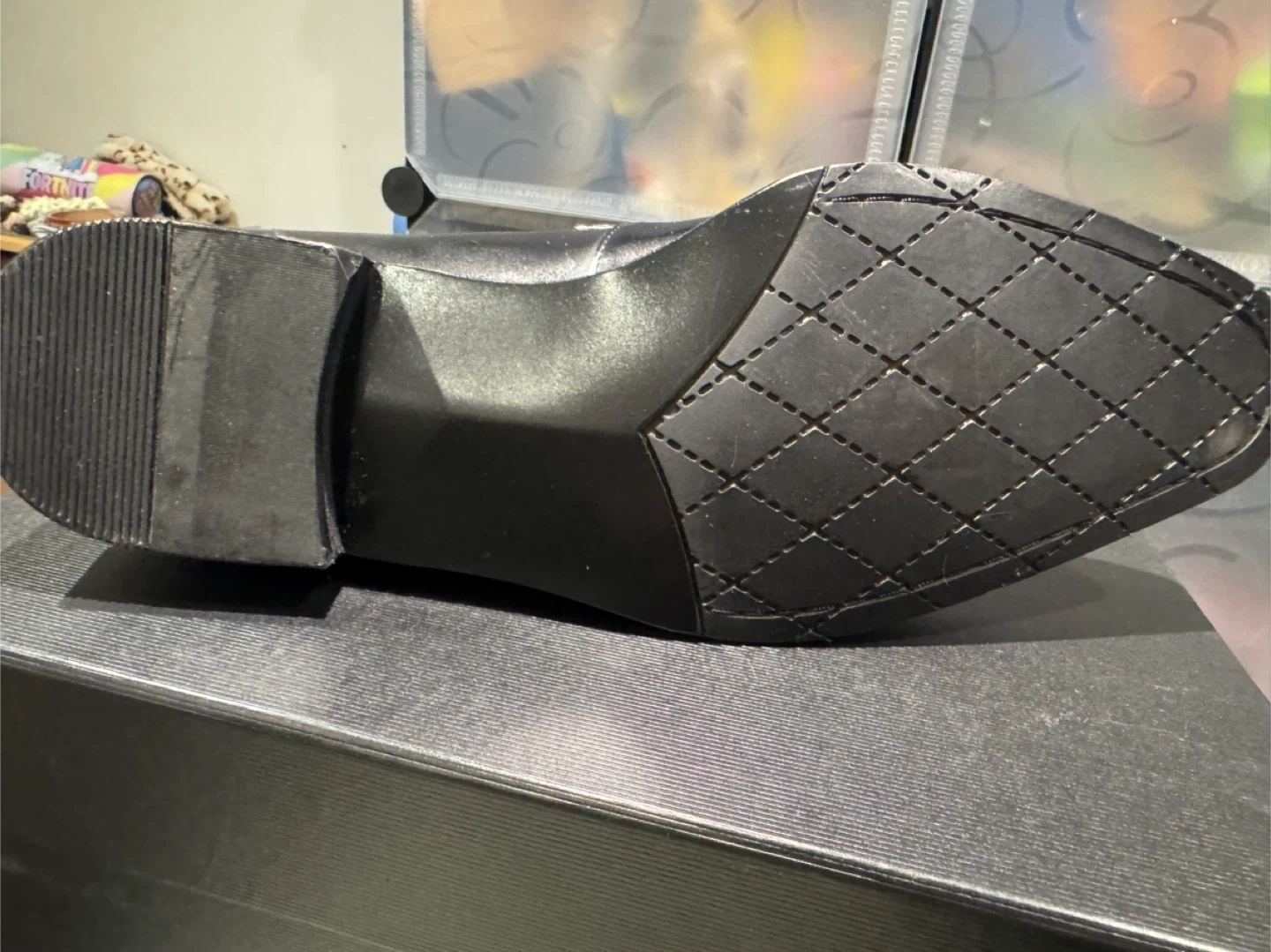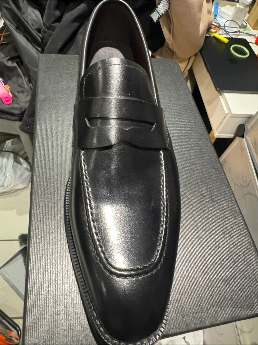 Classic black leather loafers, perfect for any dressy occasion. These shoes are a size 10. They feature a durable sole for comfort and long wear. A great addition to your footwear collection!