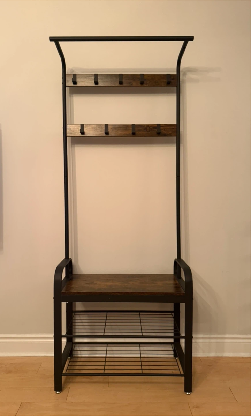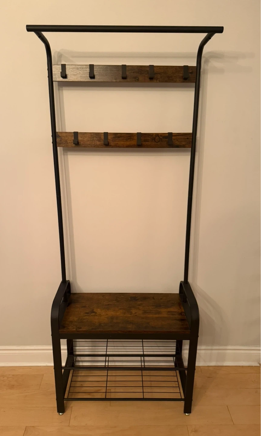 This hall tree features a rustic wood finish and black metal frame. It includes a bench, a top shelf with hooks(detachable) for coats, and a two-tier shoe rack below. Great for organizing entryways!