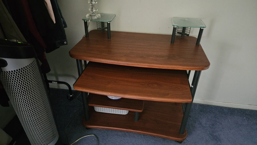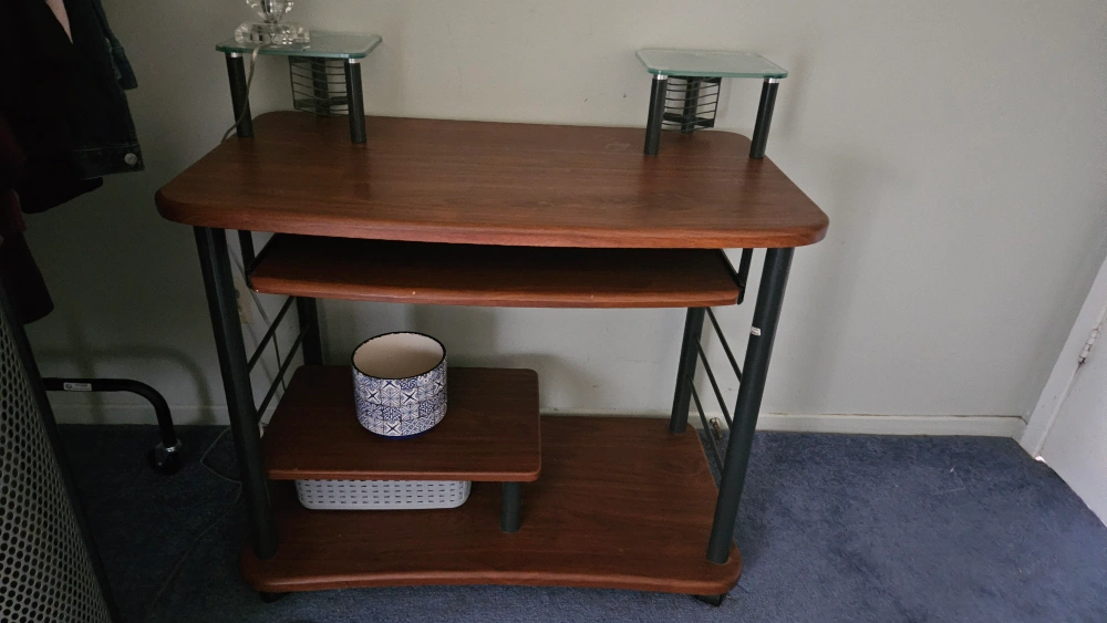 Selling a wood and metal computer desk. It features multiple shelves and a pull-out keyboard tray, perfect for a small workspace. The desk is in good condition and ready for a new home