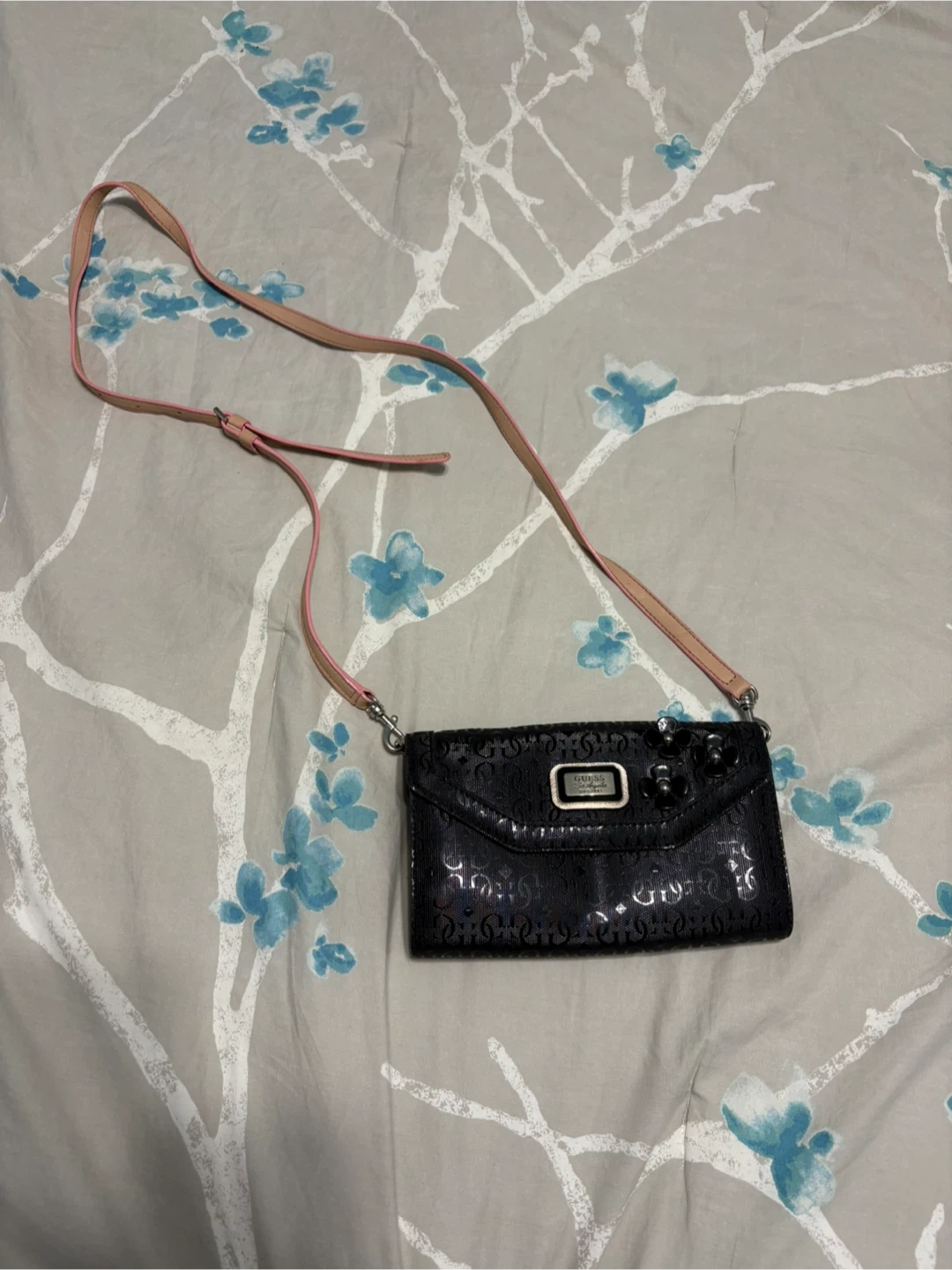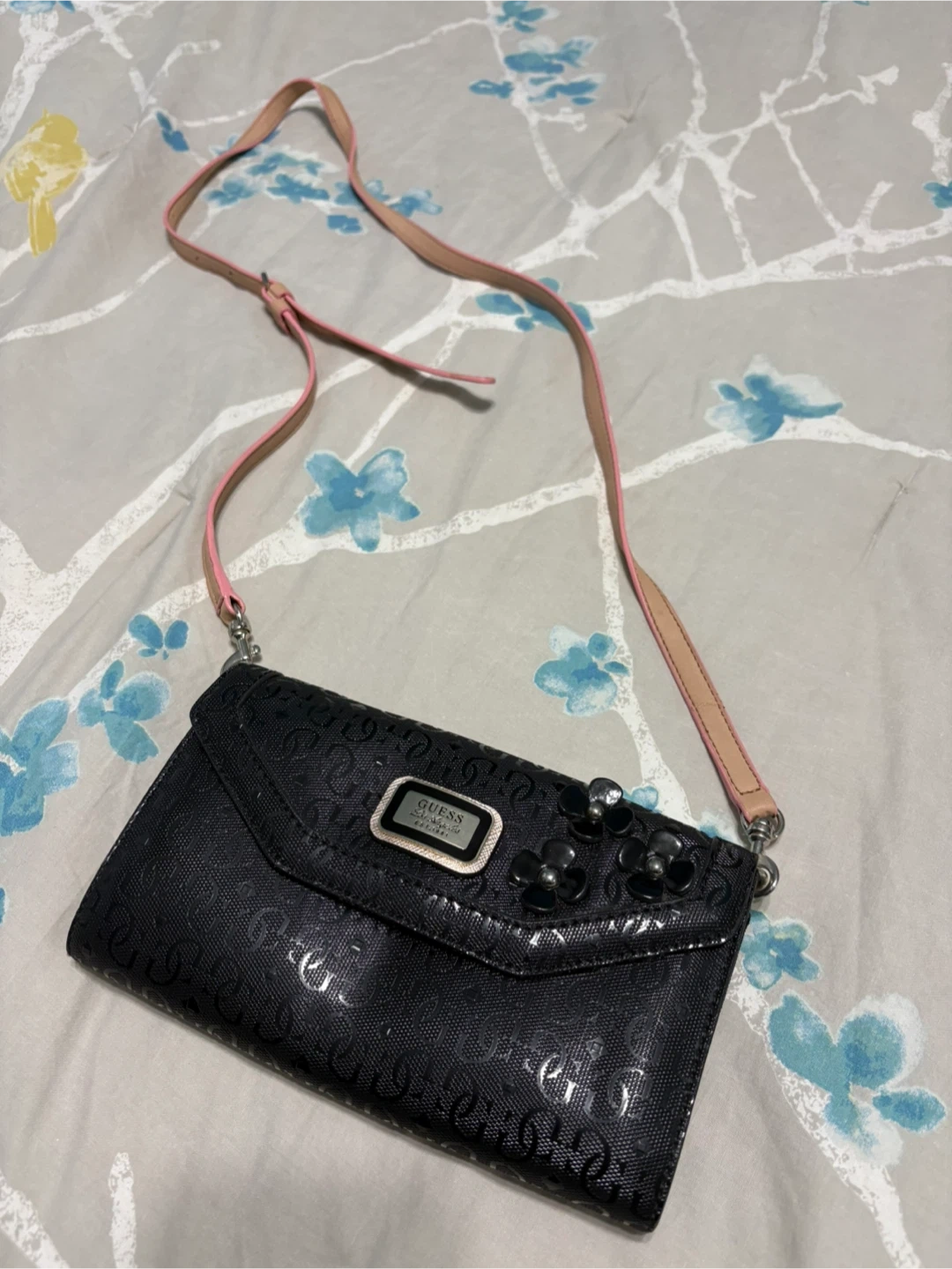 Cute Guess crossbody wallet in black with floral details! It's perfect for carrying your essentials in style. The strap is adjustable, and the interior has plenty of room for cards and cash