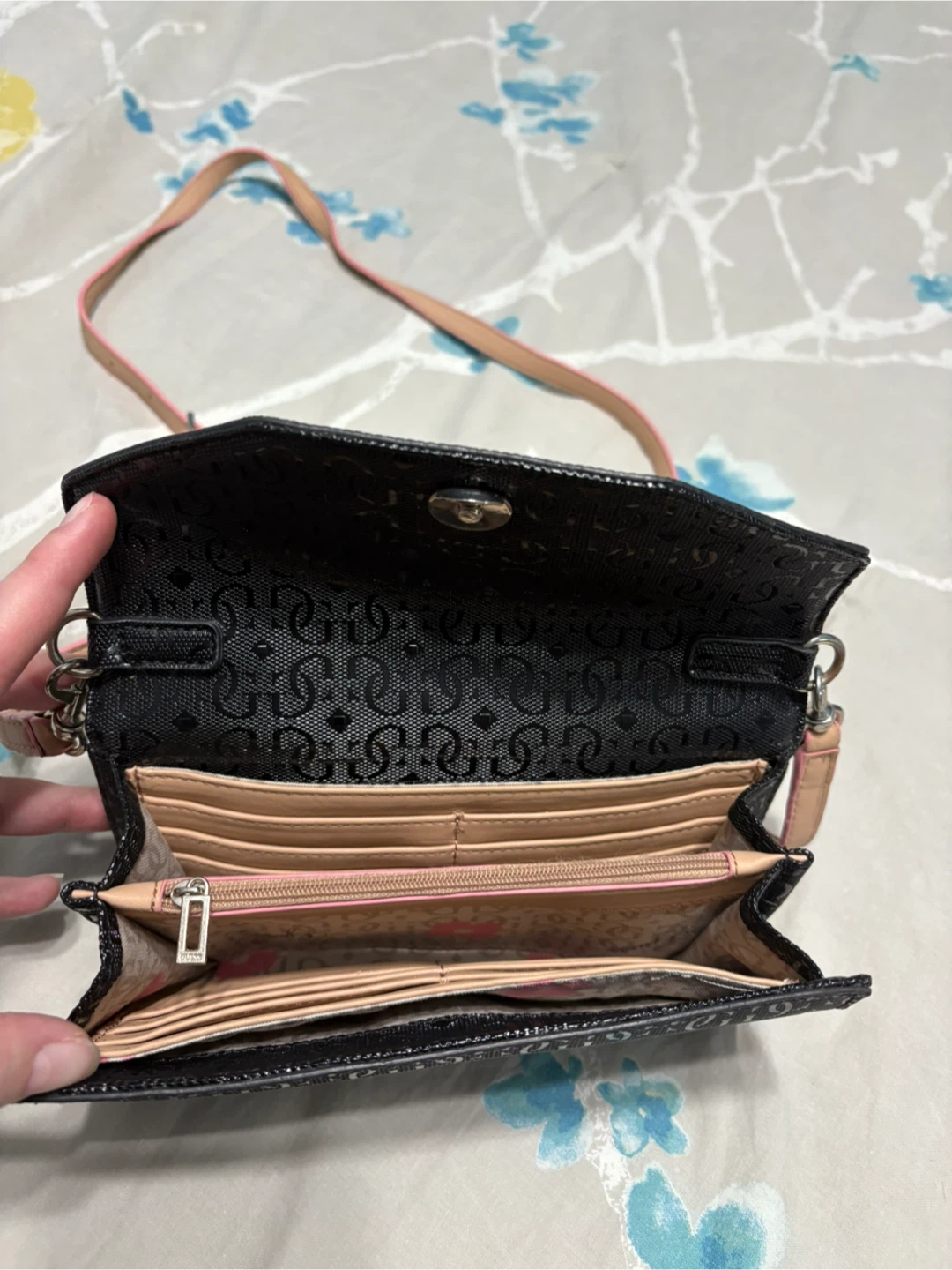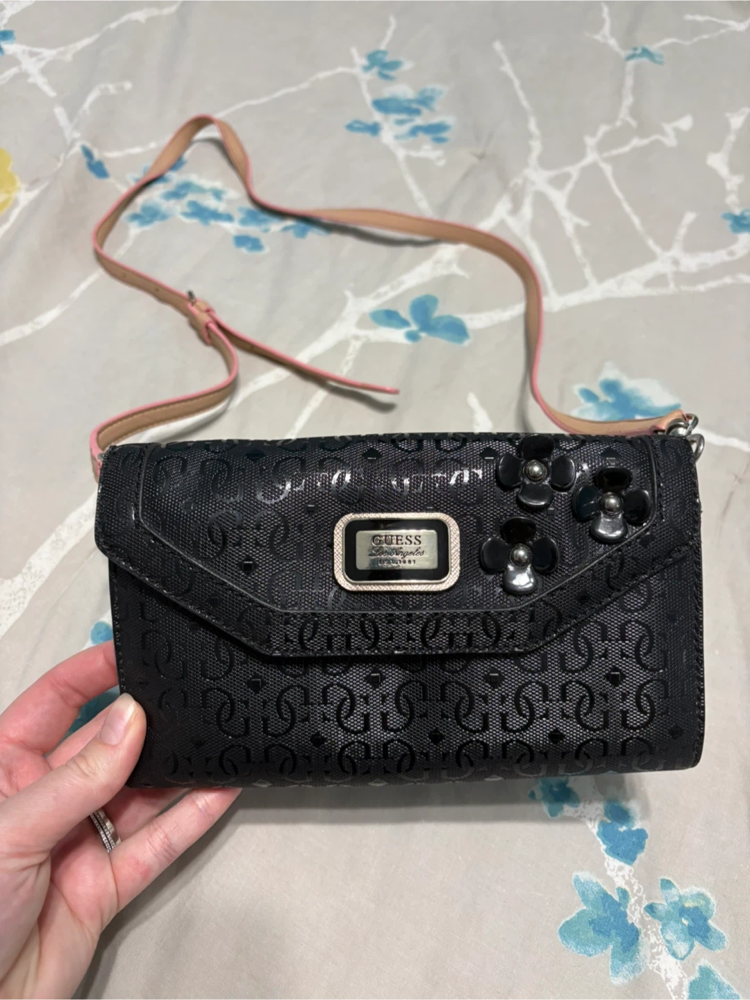Cute Guess crossbody wallet in black with floral details! It's perfect for carrying your essentials in style. The strap is adjustable, and the interior has plenty of room for cards and cash