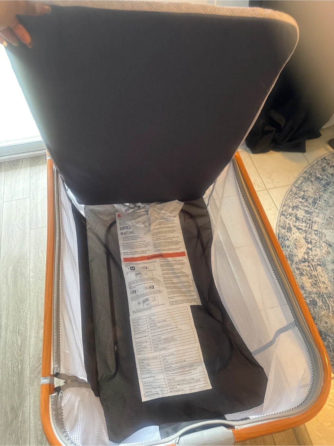 This portable bassinet is designed for convenience. It features mesh sides for ventilation and a padded mattress for comfort. It has wheels for easy movement around the house. Includes warning labels and instructions inside.