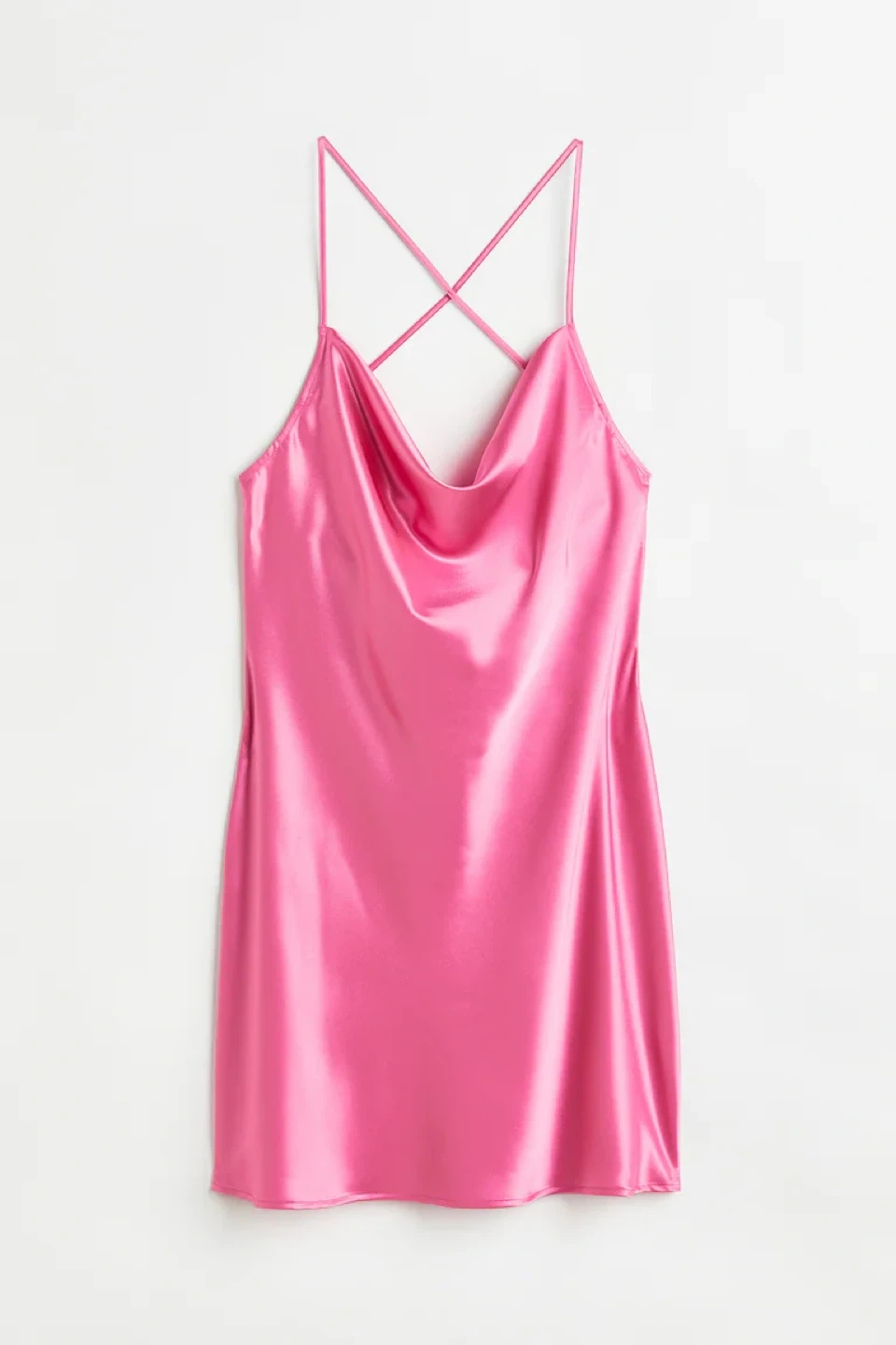 This is an H&M satin slip dress in a bright pink colour. It features a cowl neckline and criss-cross straps at the back. It's a short-length dress