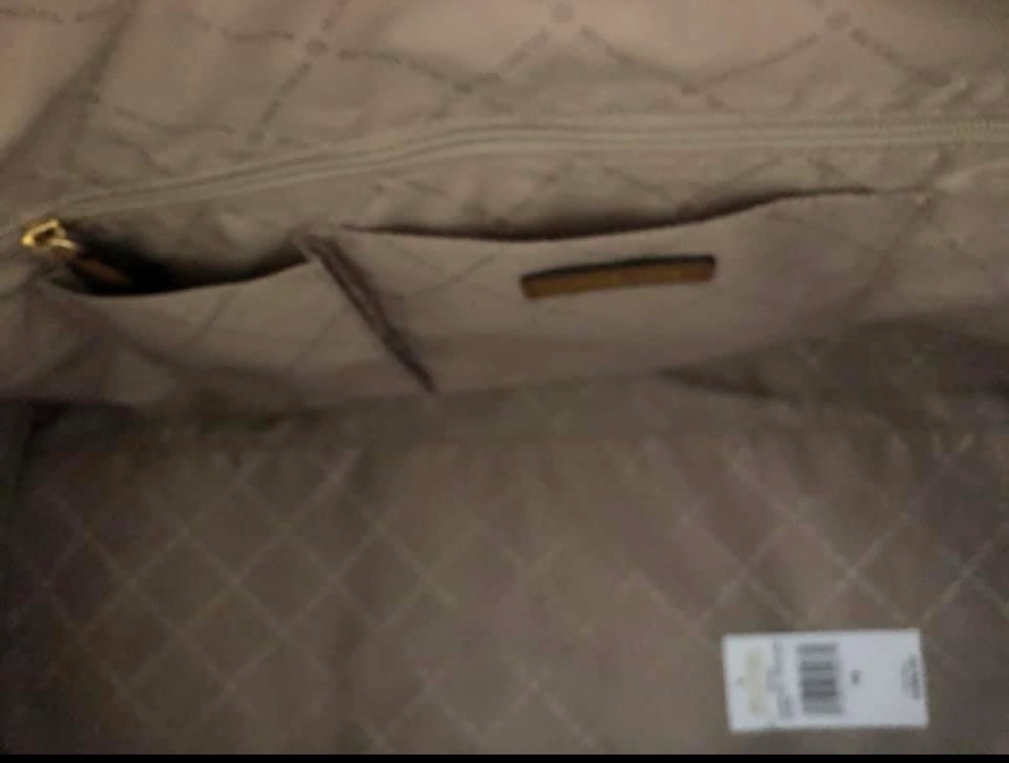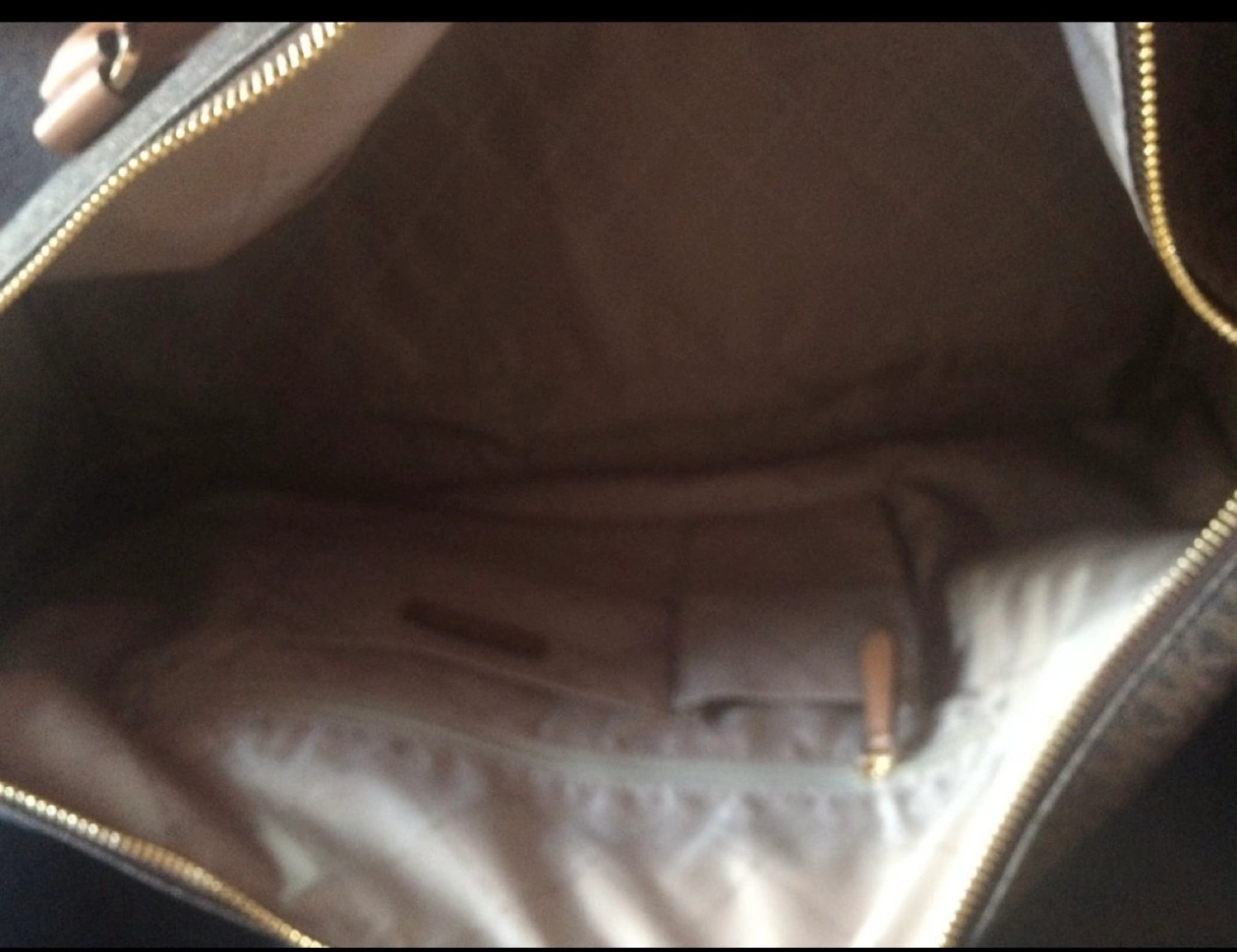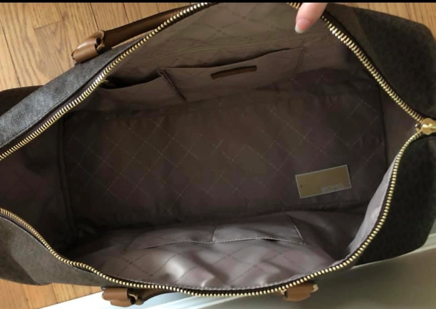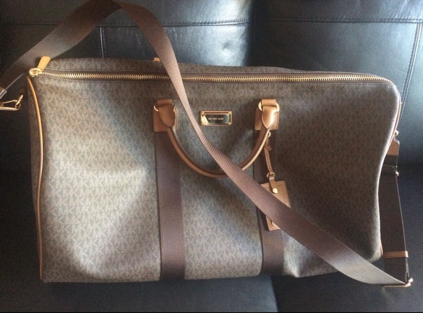 Michael Kors luggage. Brown monogrammed canvas. Gold hardware. Multiple pockets inside. Long shoulder strap. Perfect for travel.