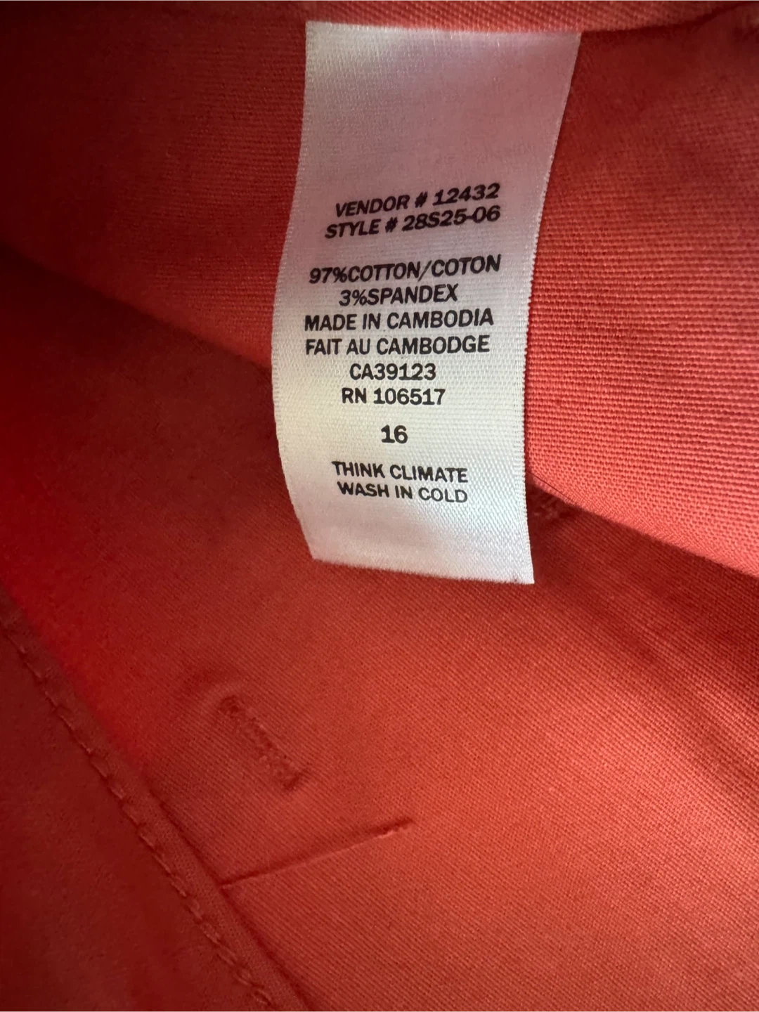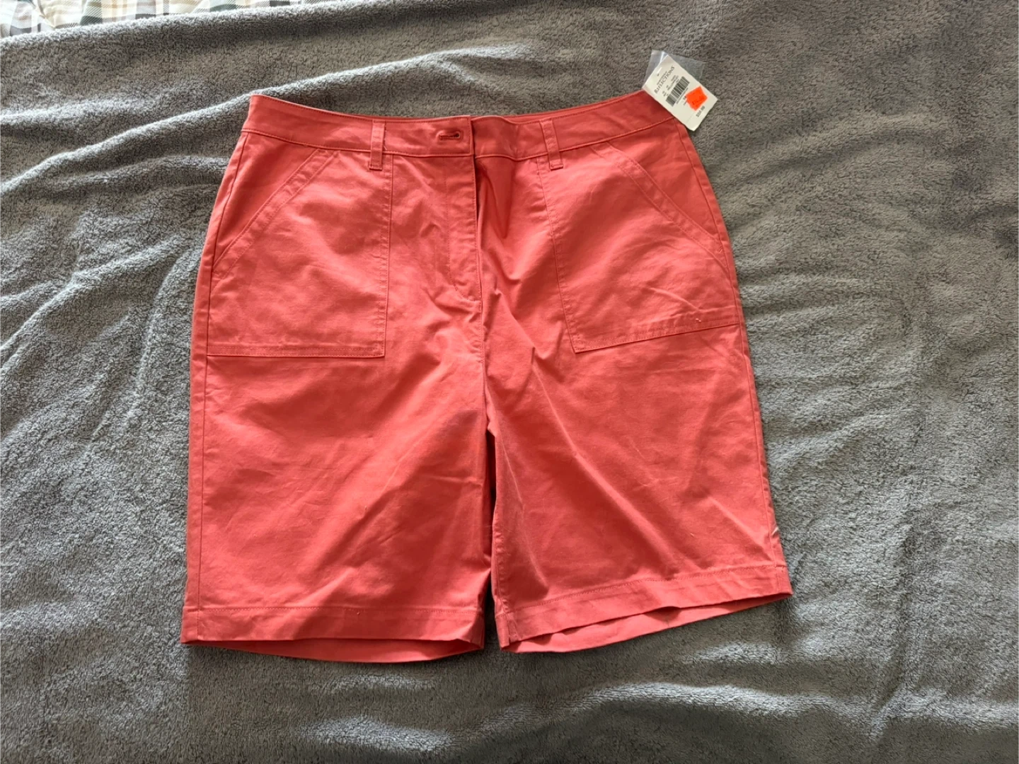 These coral shorts are made from 97% cotton and 3% spandex. They feature a comfortable fit and a classic style. Great for warm weather activities!
