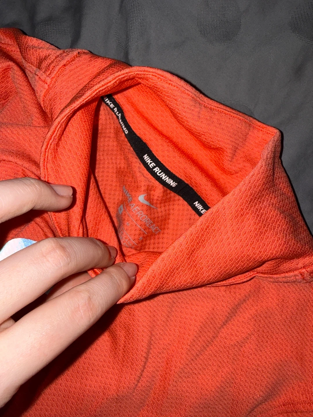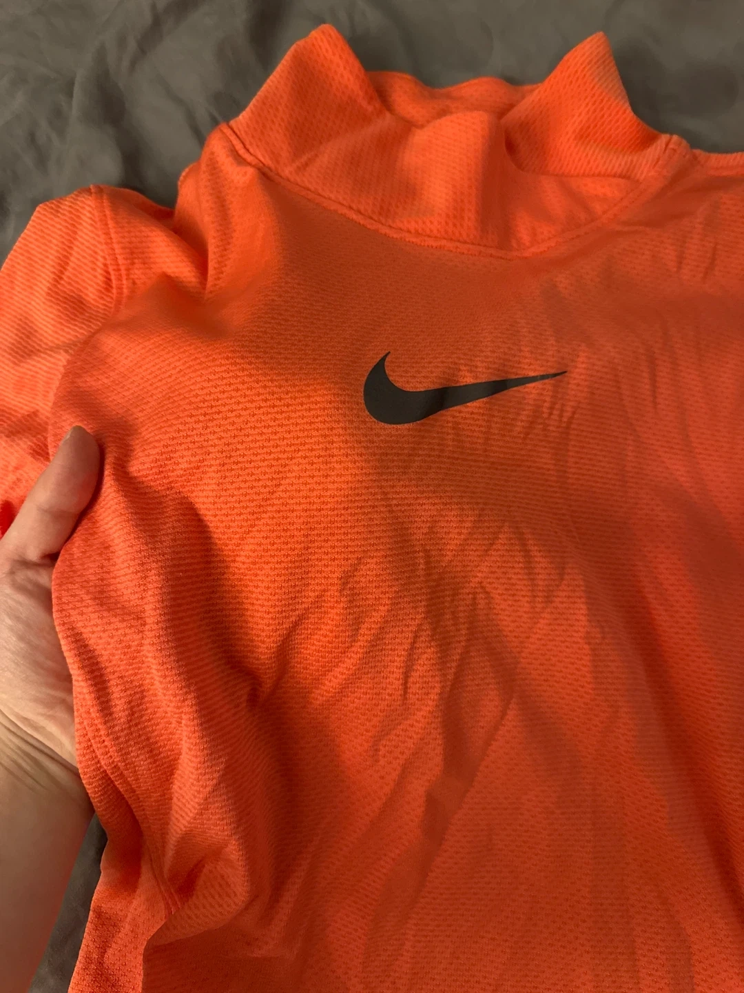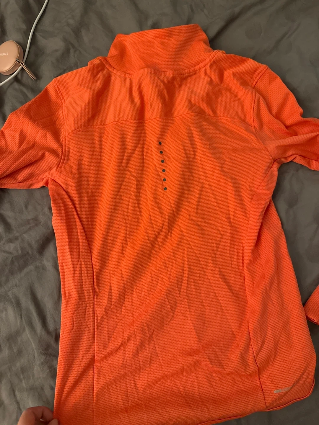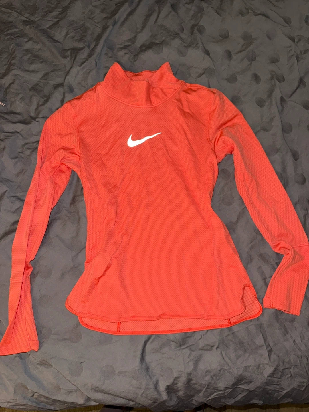 Orange long sleeve Nike running top with a mock neck. It features Dri-FIT technology for sweat-wicking comfort. Lightweight material for performance.