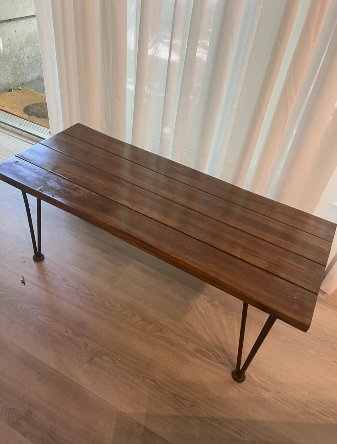 This rustic industrial coffee table featuring acacia wood and iron legs. Sturdy, stylish. Great for the patio or balcony.