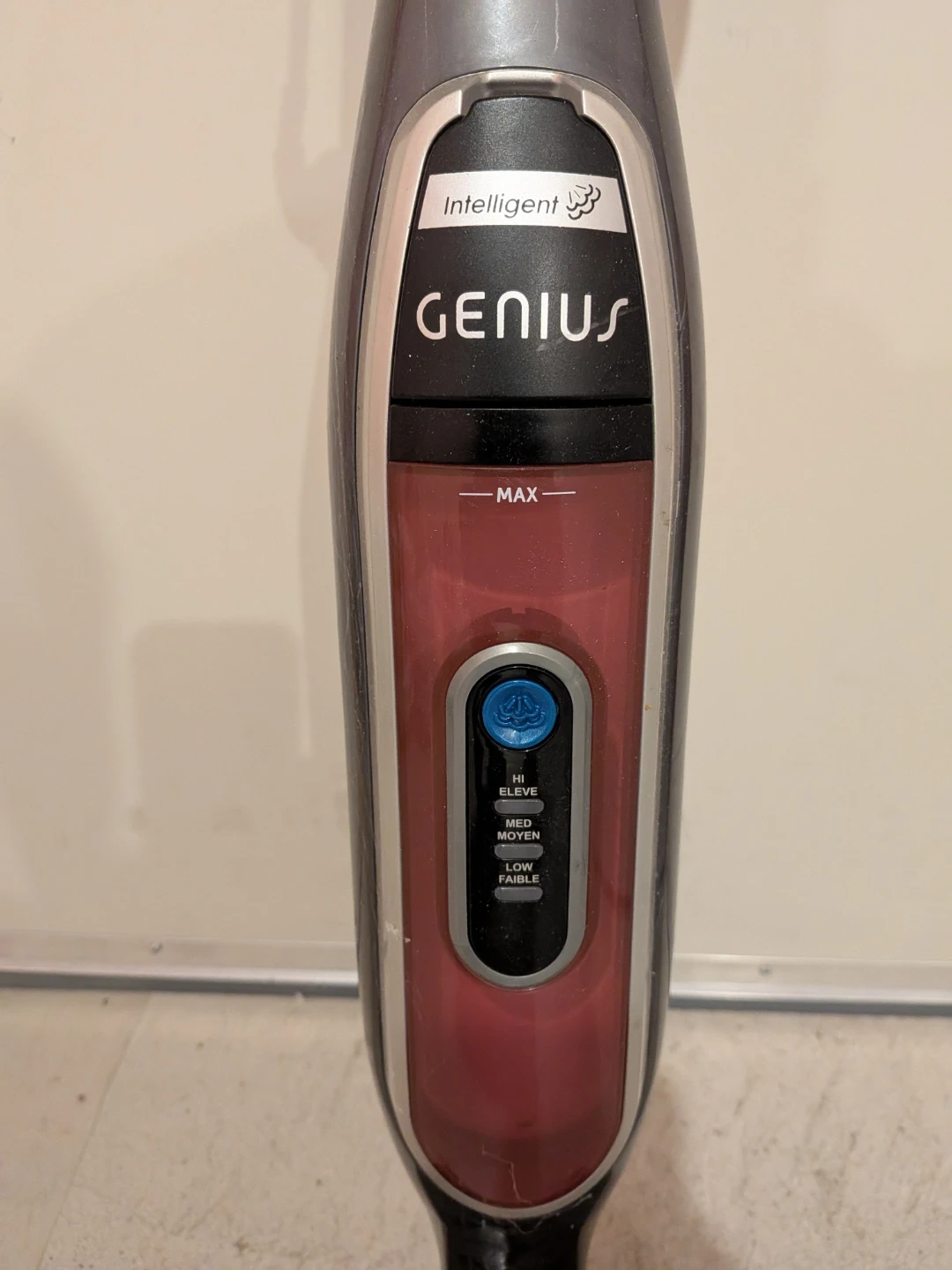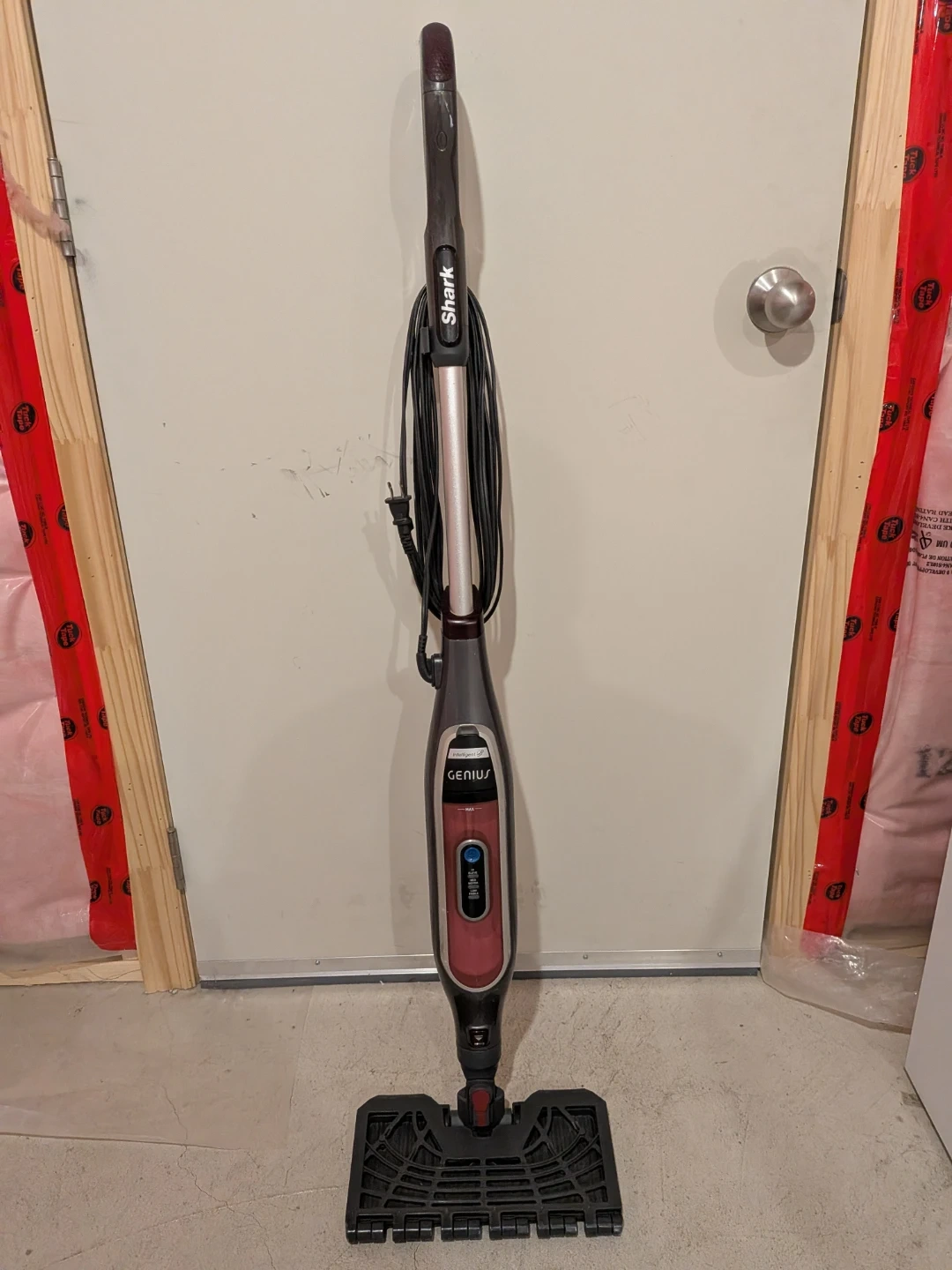 Shark Genius steam mop with intelligent steam control. Features three steam settings: Hi, Med, and Low. Great for cleaning hard floors.