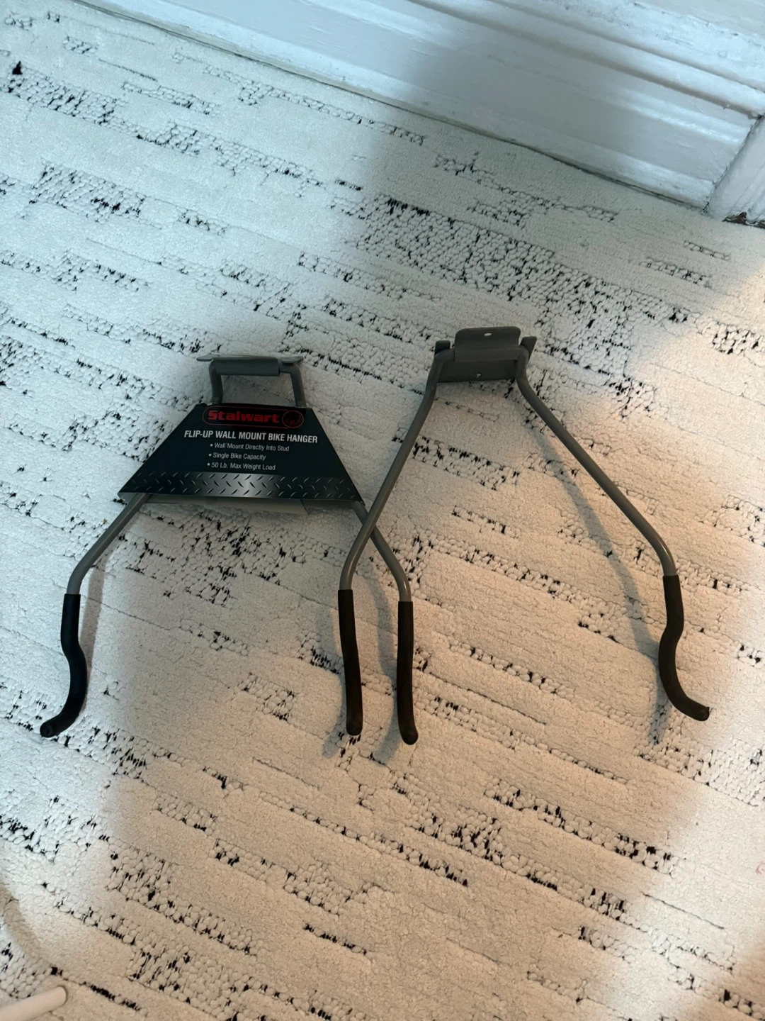 This is a Stalwart flip-up wall mount bike hanger. It mounts directly into a stud for a single bike. It has a 50 lb. max weight load capacity.