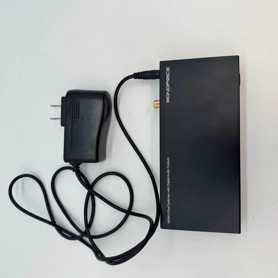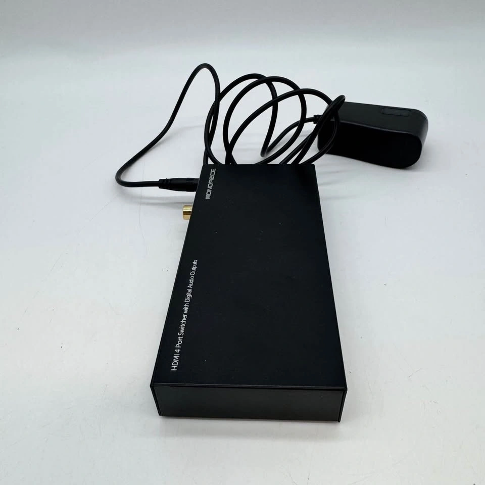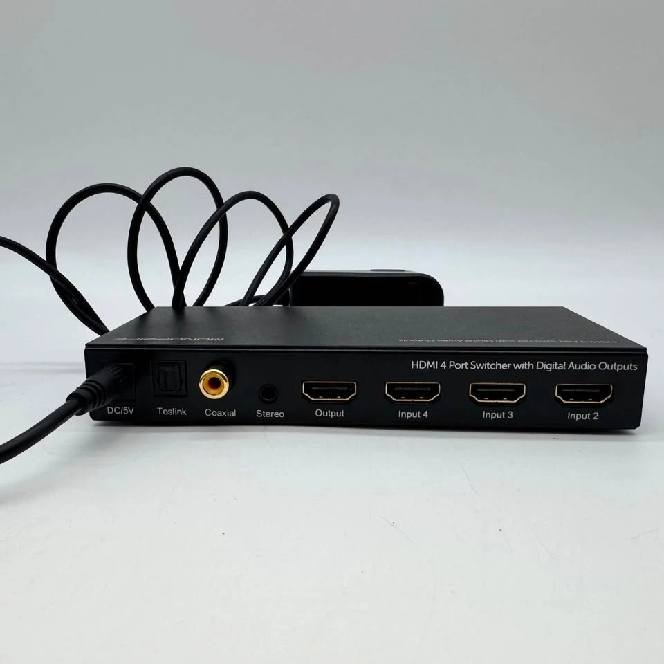 Tested and working Monoprice 4-port HDMI switcher. Great for connecting multiple devices (PS5/Xbox/Apple TV/Blu-ray, etc.) to one TV or monitor. It also has built-in digital audio outputs for sound systems.