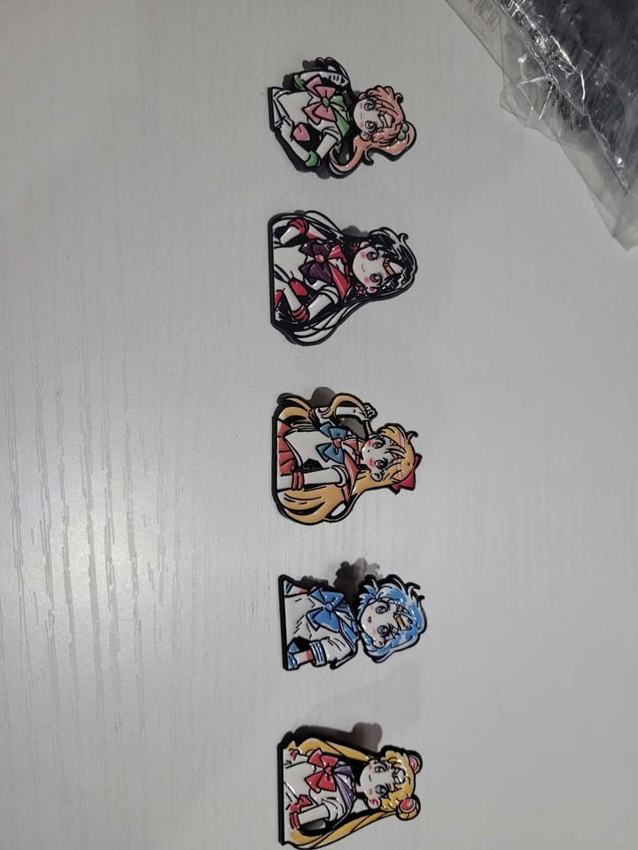 Sailor Moon enamel pins featuring various characters: Moon, Mars, Venus, Jupiter, and Mercury. $5 each. Pickup in Spruce Grove.