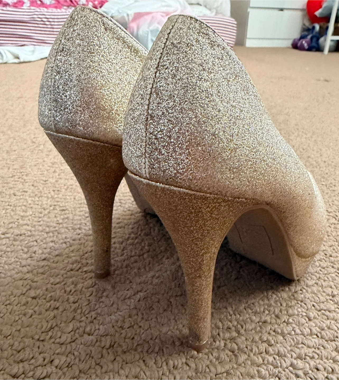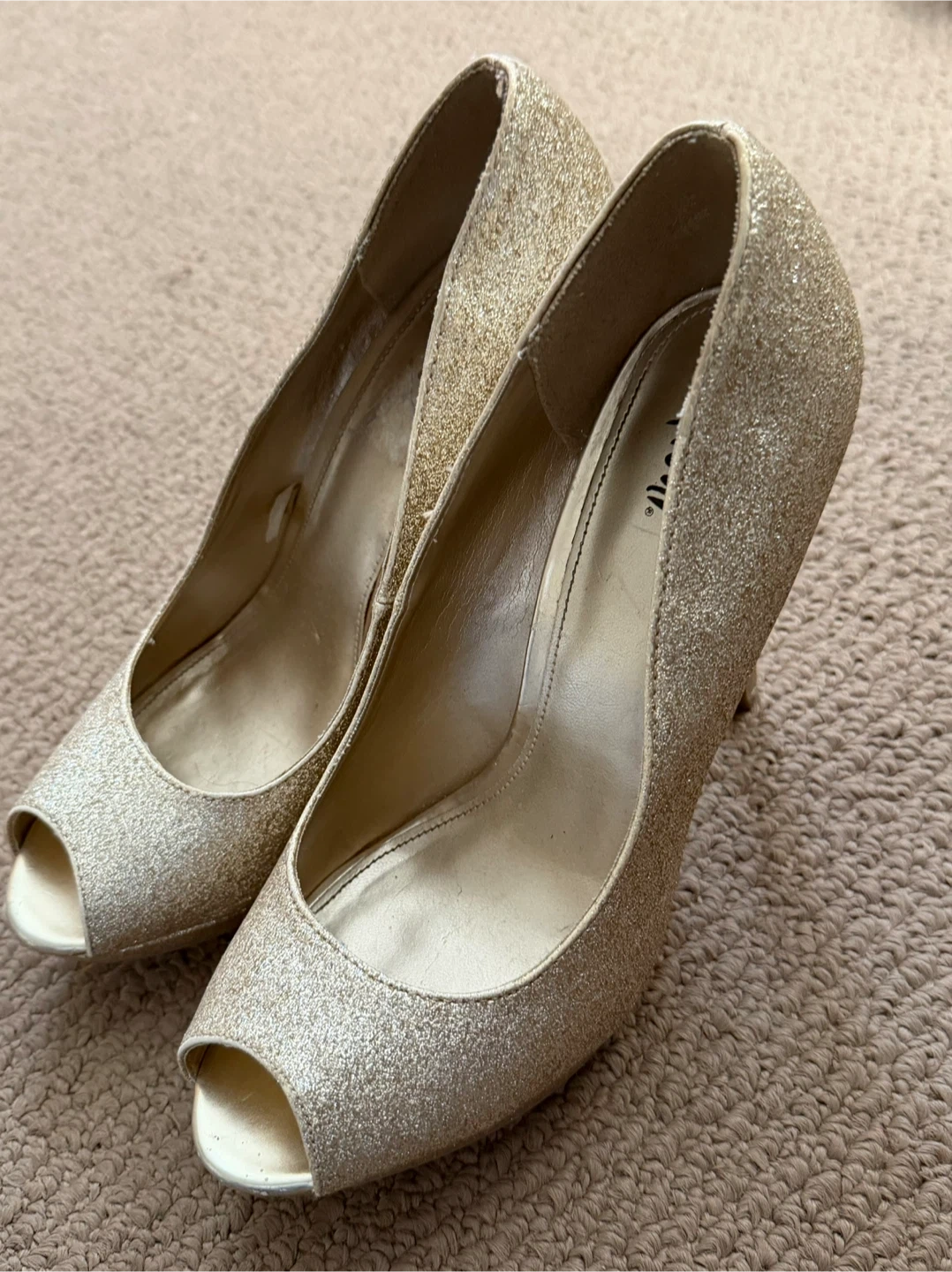 Sparkly gold glitter peep-toe heels with a comfortable heel height. These shoes are perfect for special occasions or adding some glam to your outfit. The glitter is securely applied and catches the light beautifully.