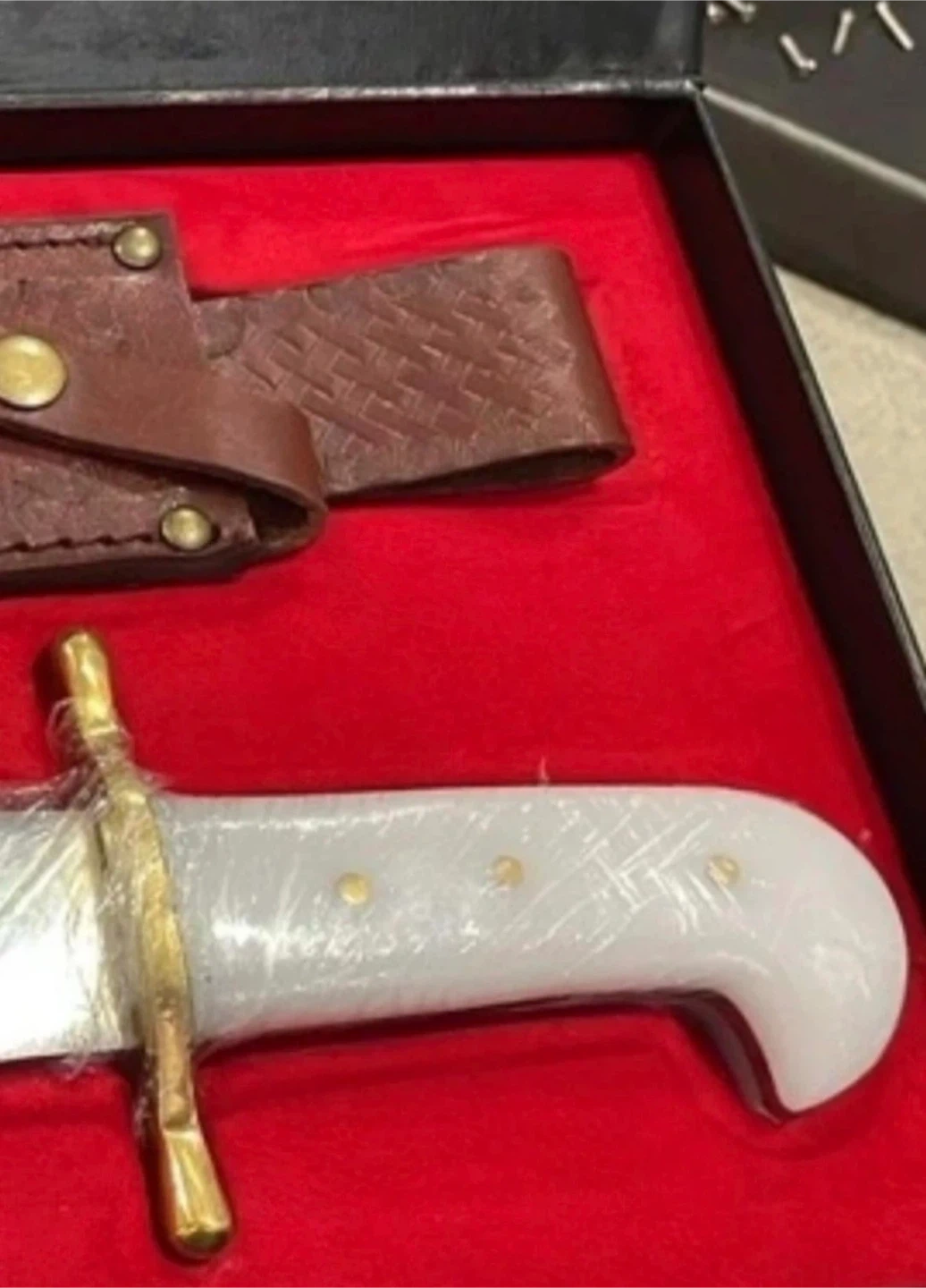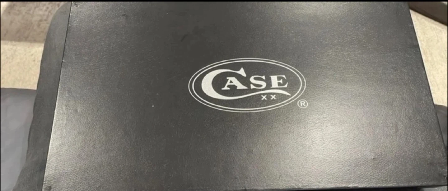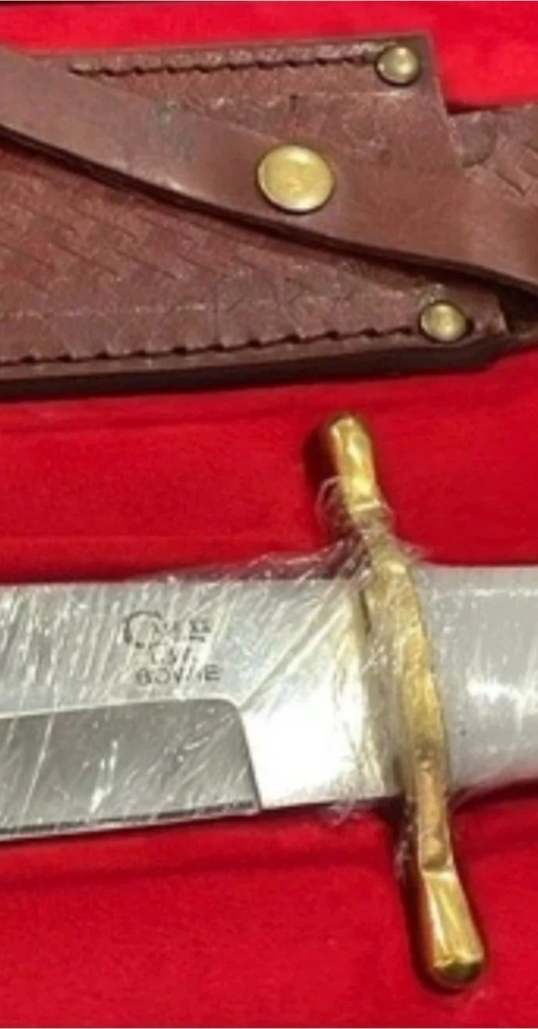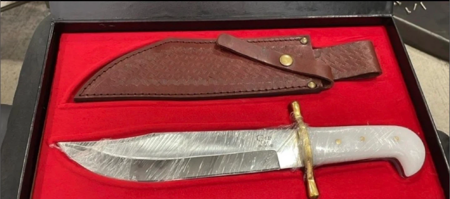 This is a Case XX Bowie knife, complete with a leather sheath. It's presented in a fitted box, perfect for collectors. The handle is white and gold.