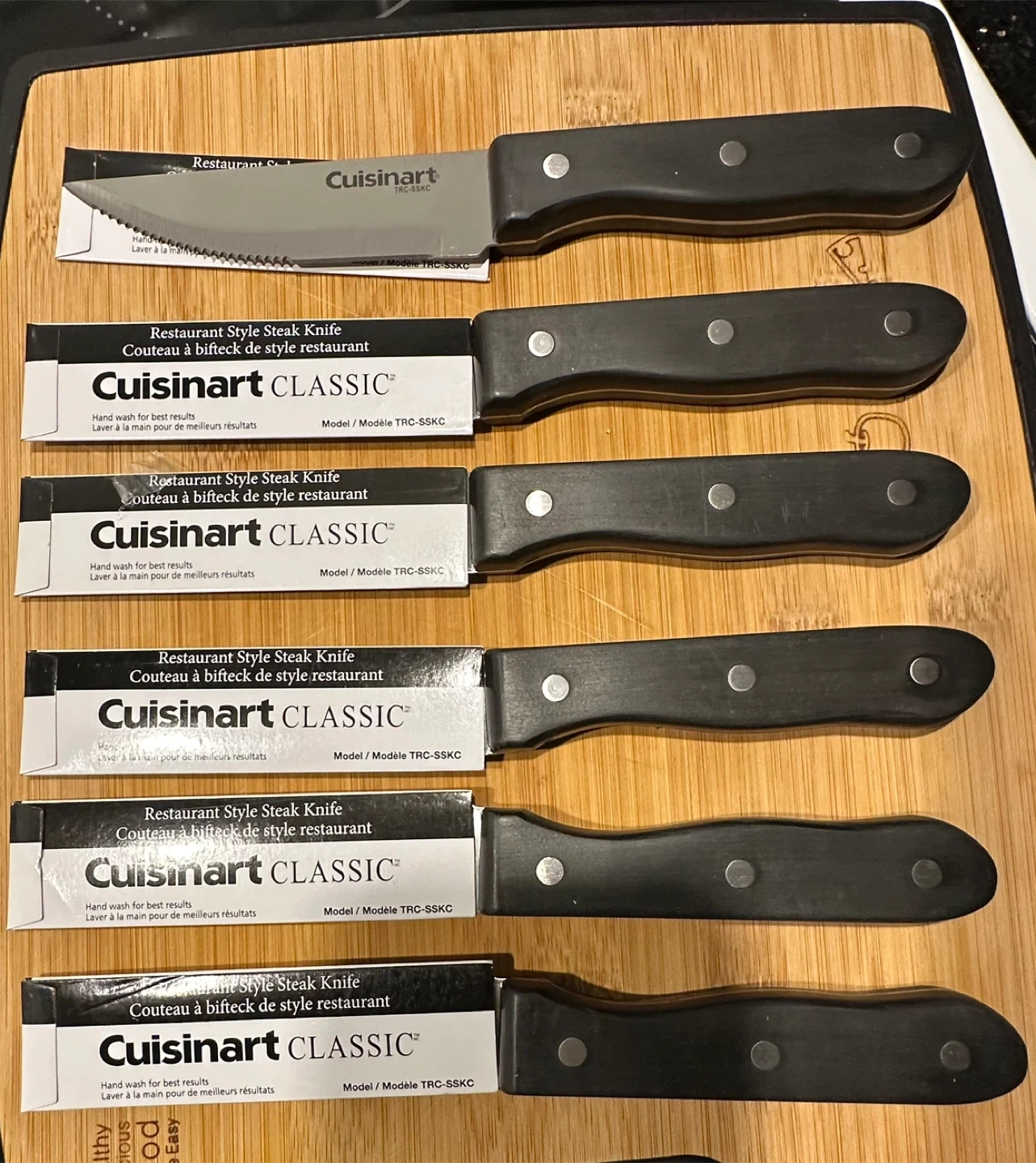 $20-Brand new set of 6 Cuisinart Classic steak knives with serrated blades. They're restaurant style and made for easy cutting. They have full tang construction with triple rivets for durability.