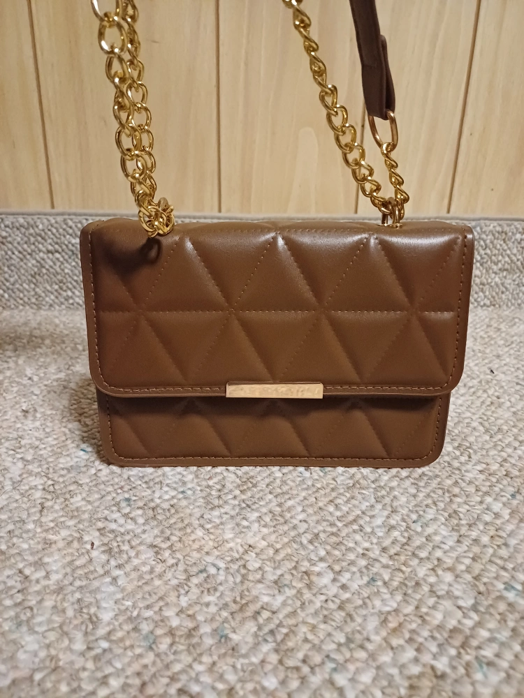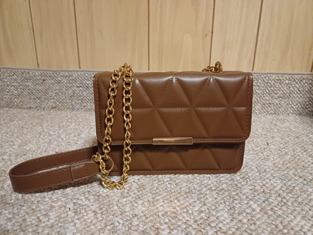 Stylish brown shoulder bag can be sling bag as well. Features a gold chain strap and diamond pattern. Perfect for a night out or special event. You can carry all your essentials with ease.