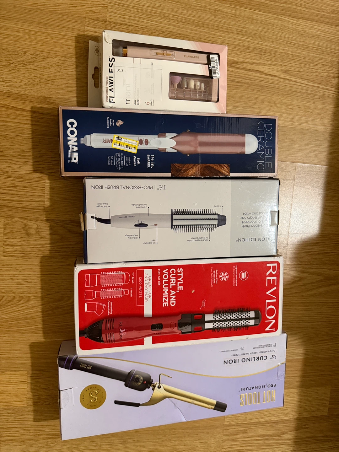 Variety of hair styling tools including a curling iron, brush iron, and stylers. Brands include Hot Tools, Revlon, Conair, Salon Edition, and Flawless. Some tools are new in box.