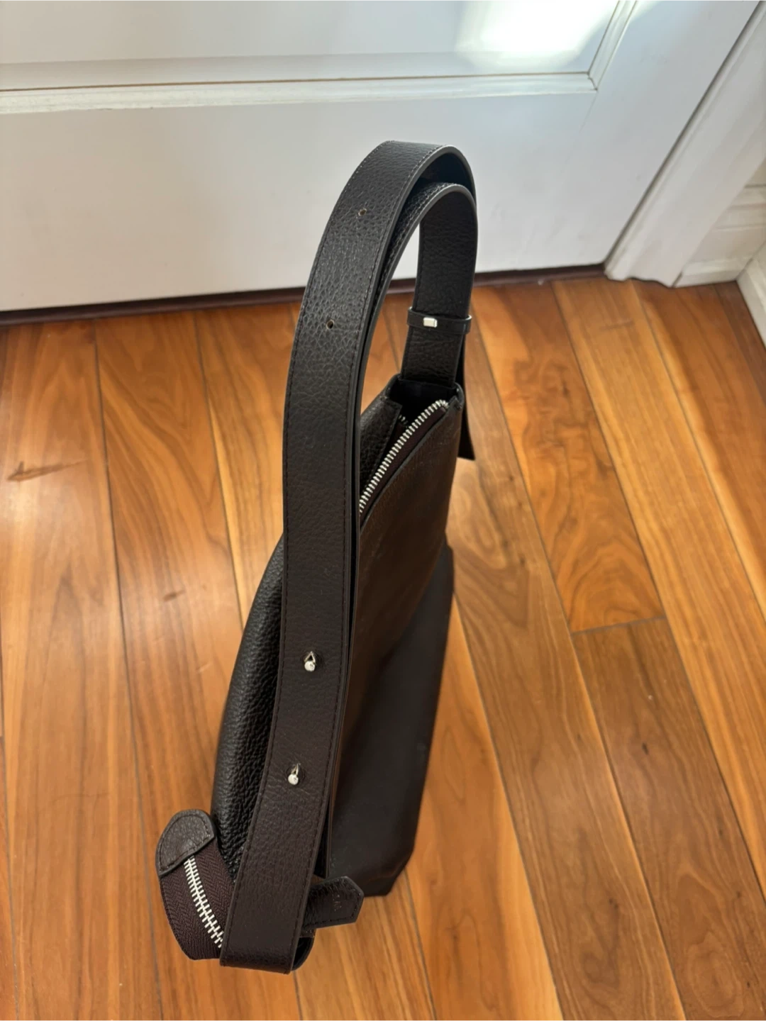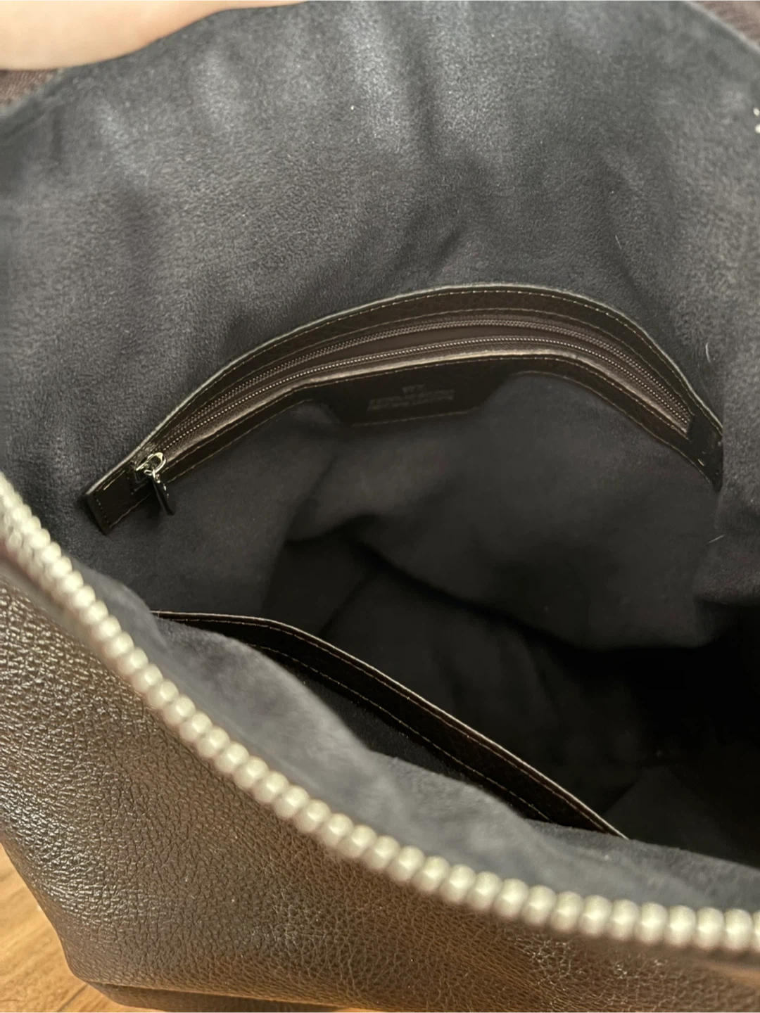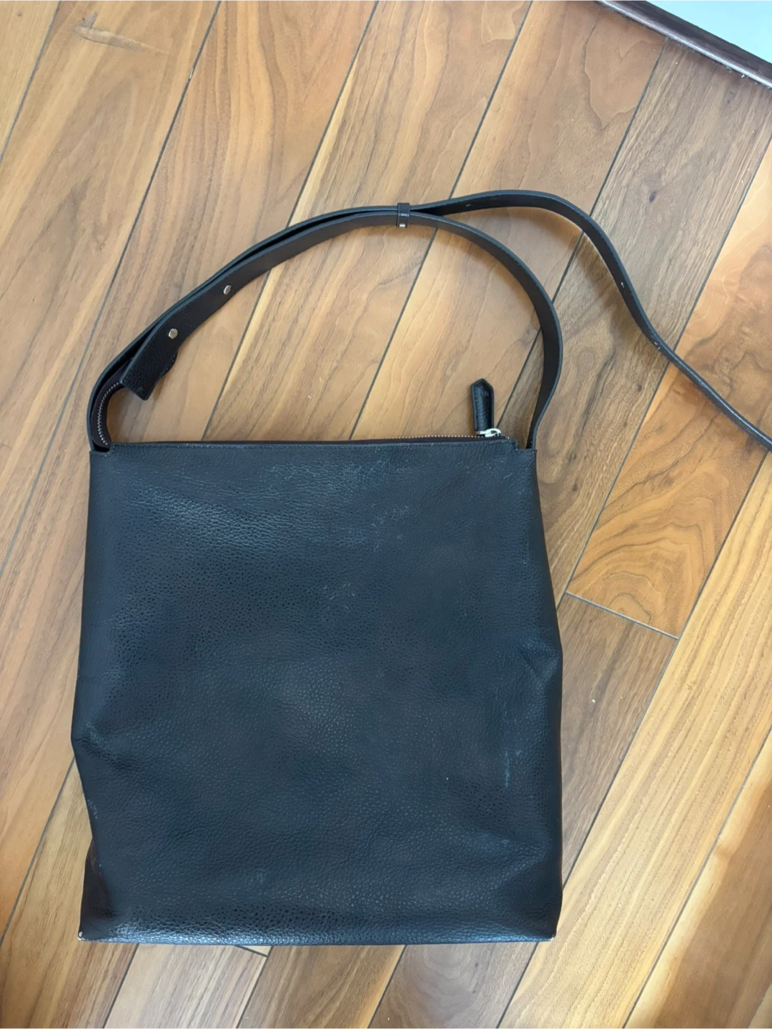It has a zippered main compartment and an interior zippered pocket. The strap is adjustable.