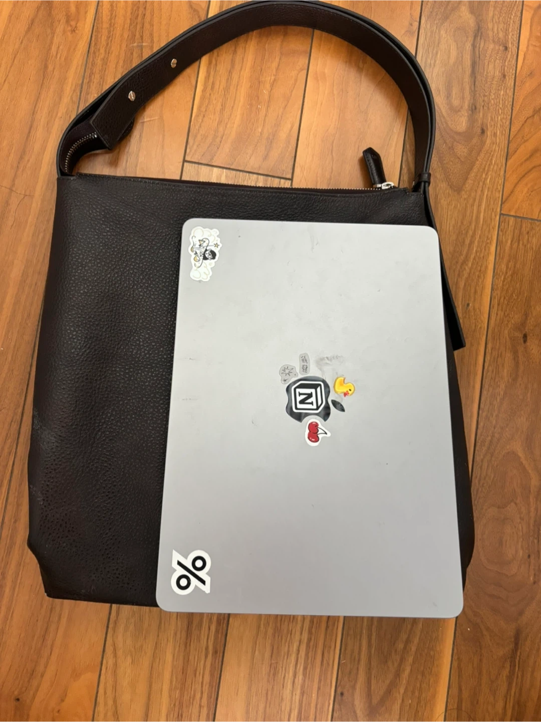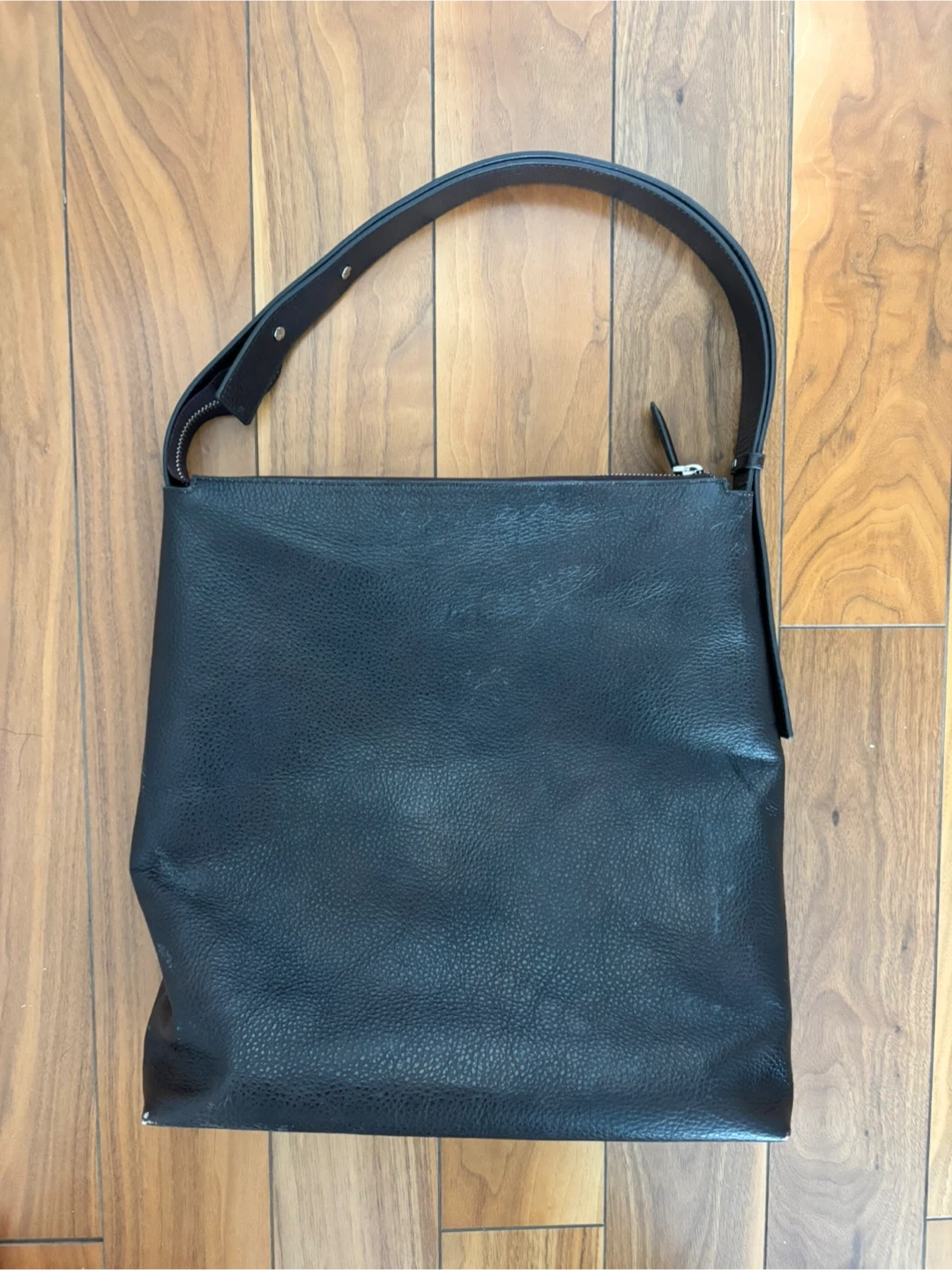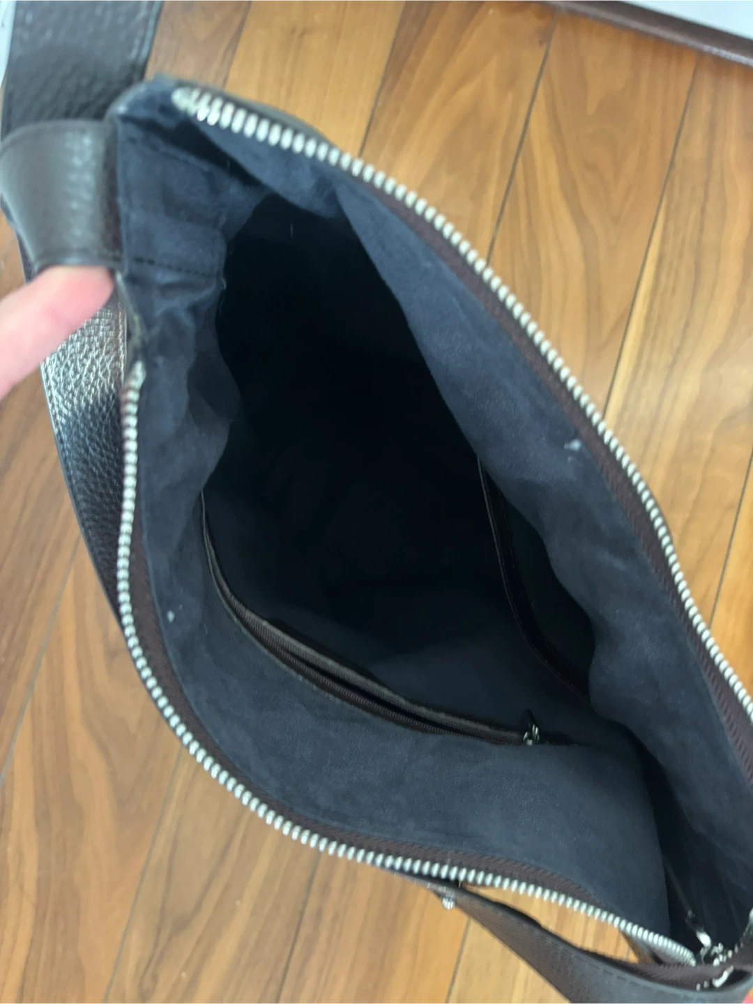 It has a zippered main compartment and an interior zippered pocket. The strap is adjustable.