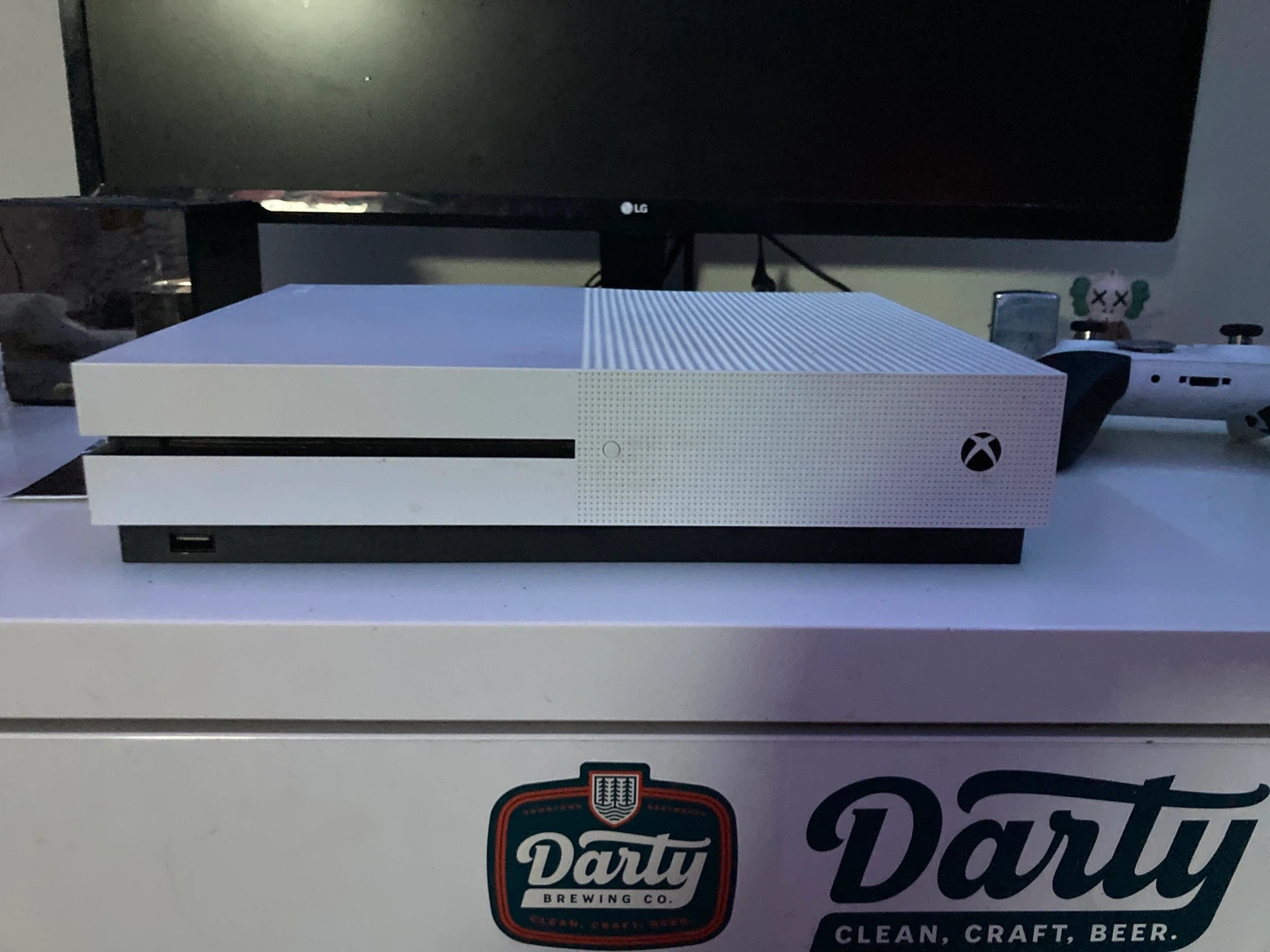 White Xbox One S console. Includes Call of Duty: Ghosts, Just Dance, and NBA 2k17 games for Xbox One. Also comes with a bright green controller. Perfect for gaming nights!