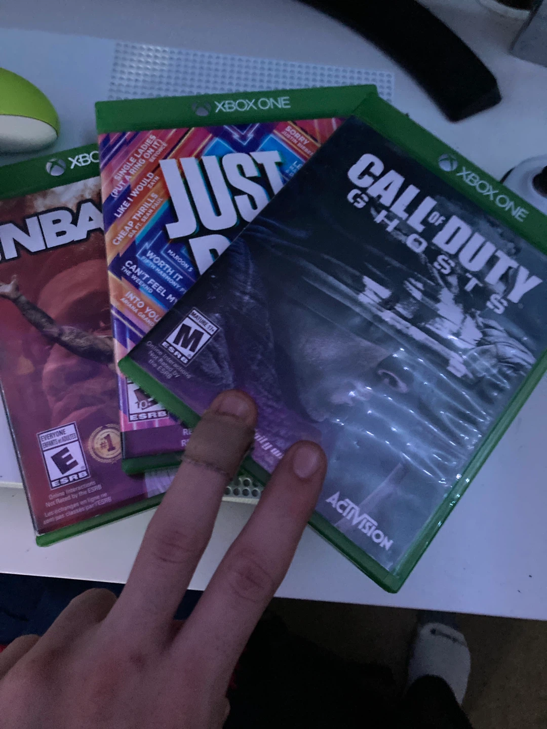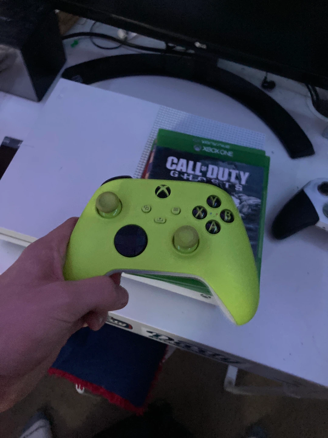 White Xbox One S console. Includes Call of Duty: Ghosts, Just Dance, and NBA 2k17 games for Xbox One. Also comes with a bright green controller. Perfect for gaming nights!