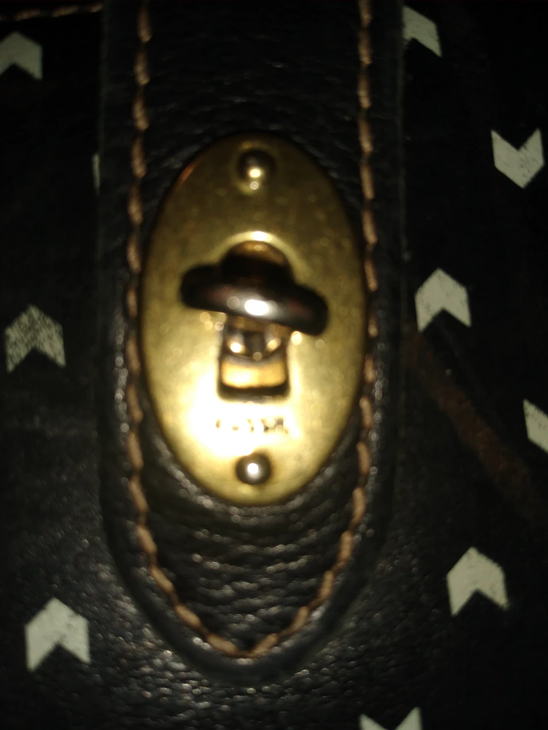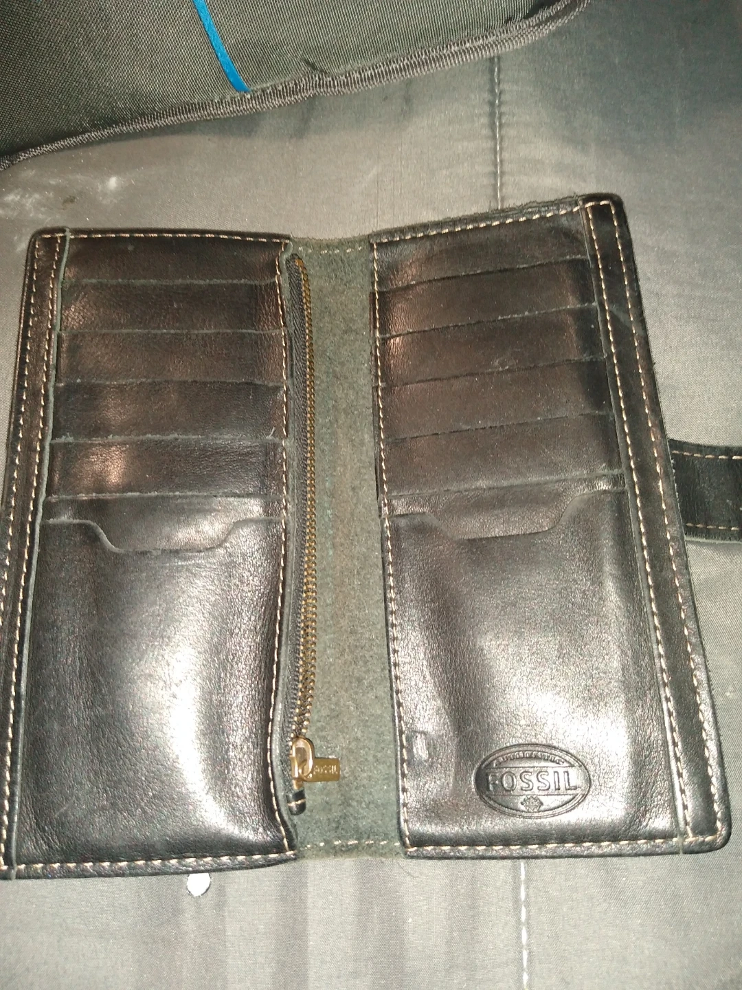 This is a really fashion forward leather wallet it's by fossil it's got a nice conservative print on the leather it's brand new not used has no rips or tears or scratches on it it's really just really cool and the pattern is hip but hip and Chic but also sophisticated. Anybody would really love this wallet it just makes you feel good when you go to unbutton it and use it at all.
