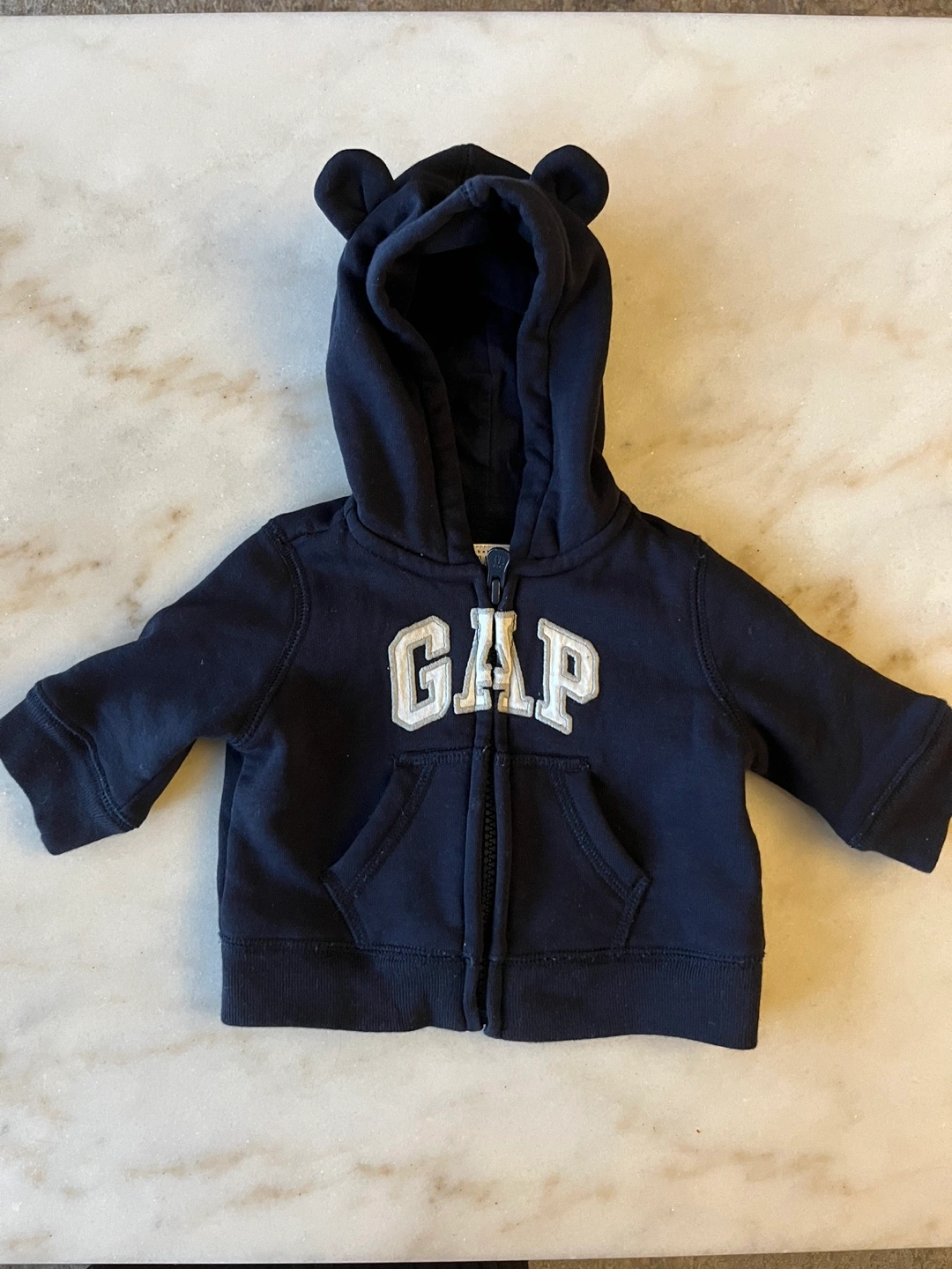 Adorable baby zip-up hoodie. Features bear ears on the hood and a GAP logo. Great for keeping your little one warm and cozy.