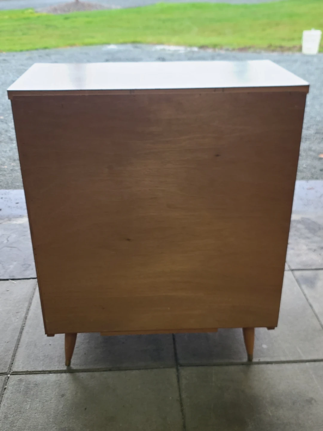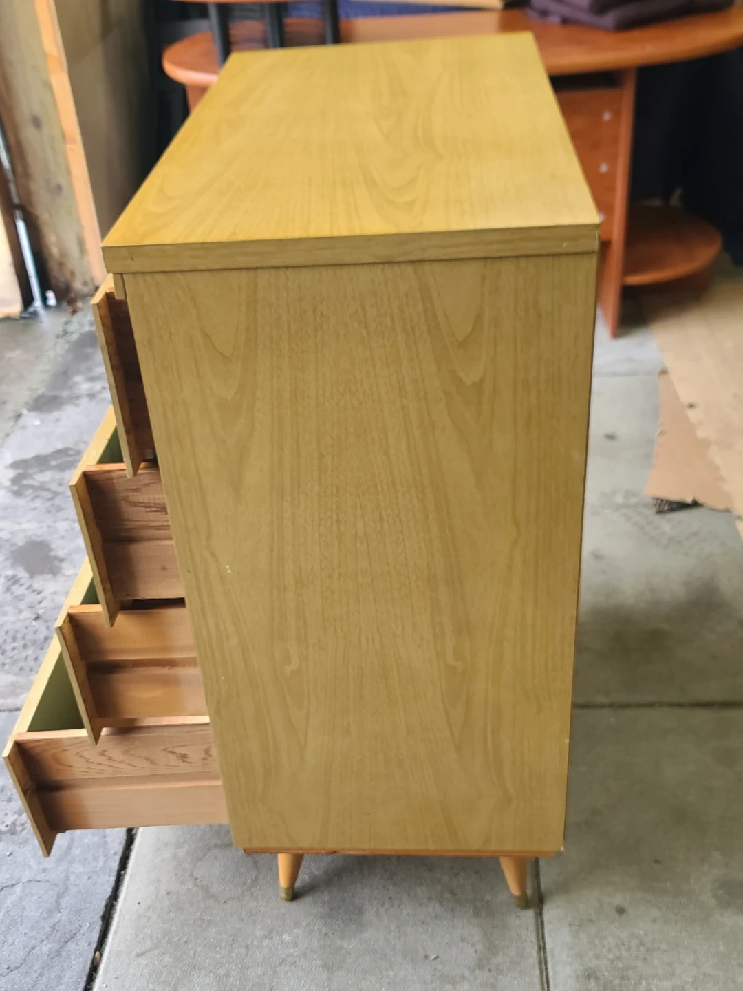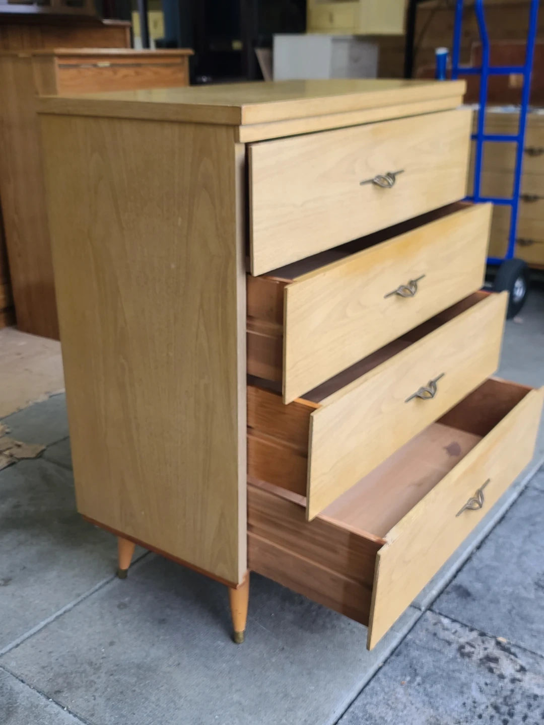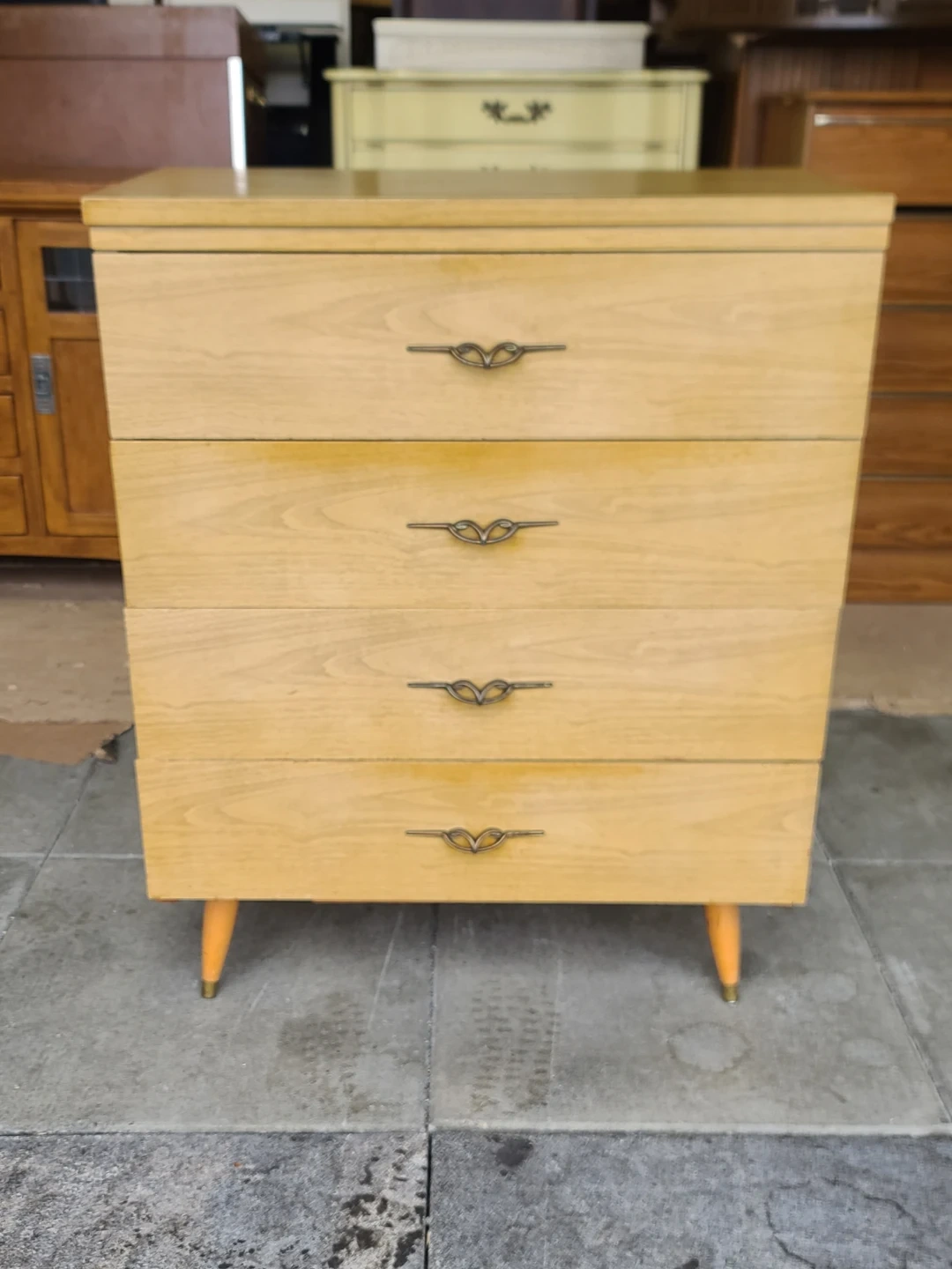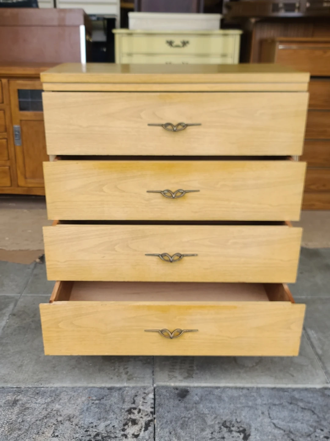 A lovely cintage 4-drawer dresser. It has a light wood finish and unique drawer pulls. The dresser has four drawers, perfect for organizing your clothes and other items. It's in good condition and ready to add some vintage charm to your home! Measurements: W 32" × D 17 1/2" × H 40". Delivery can be arranged. Viewing and pickup by appointment.