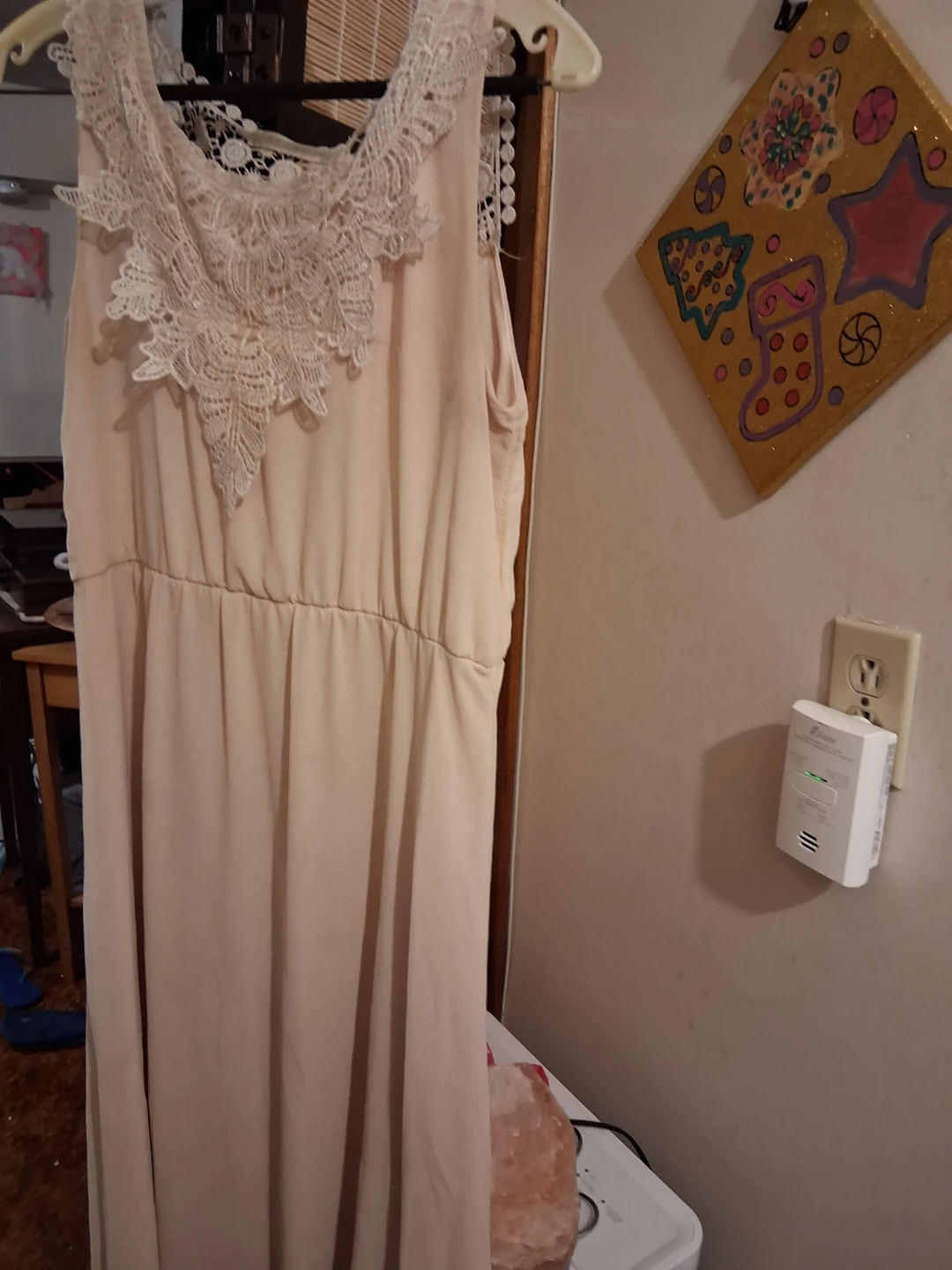 This is a lovely cream-coloured dress featuring delicate lace detailing around the neckline. It's in great condition and ready for a new wardrobe! The dress has a flowy, comfortable fit that's perfect for various occasions. It's a stylish and elegant piece that would look great on anyone