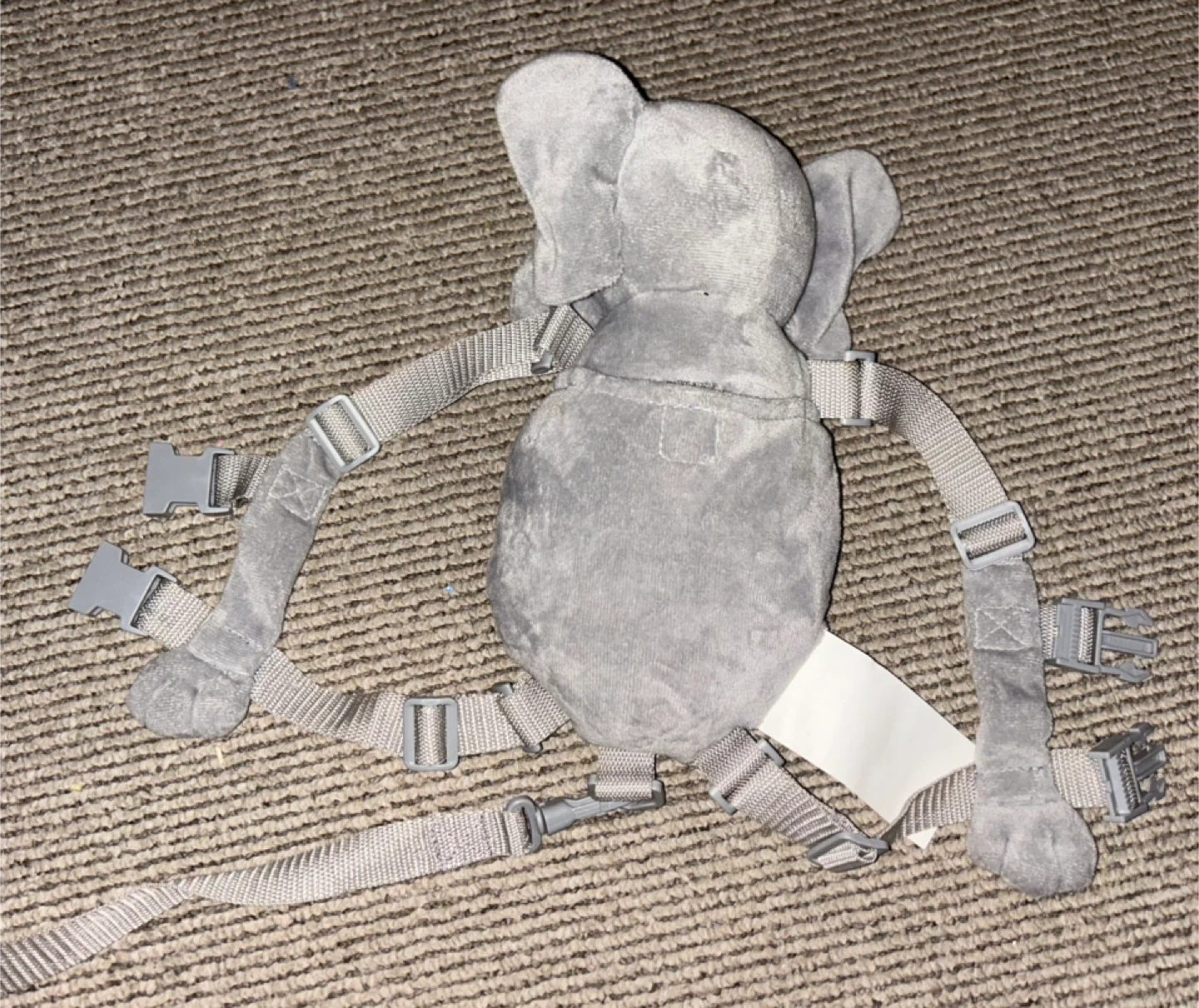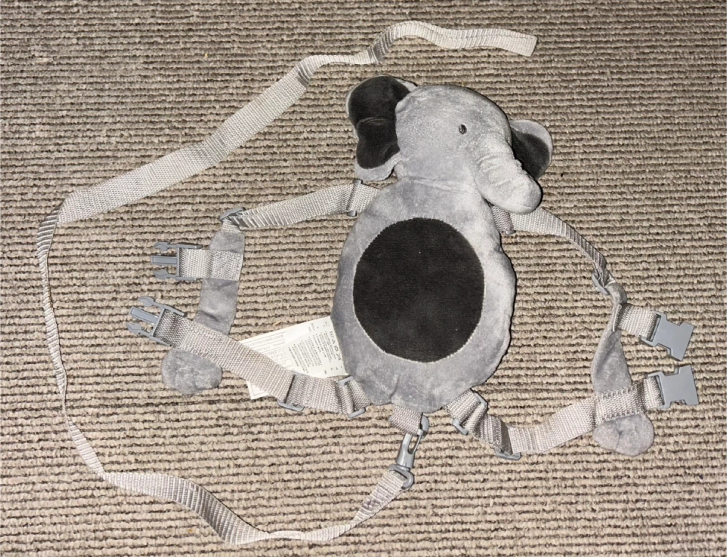 Safety first! Soft plush elephant backpack designed for toddlers. It's grey with a darker grey circular patch on the front. Includes adjustable straps and a detachable tail tether for safety. This harness backpack helps keep little ones close and safe while out and about!