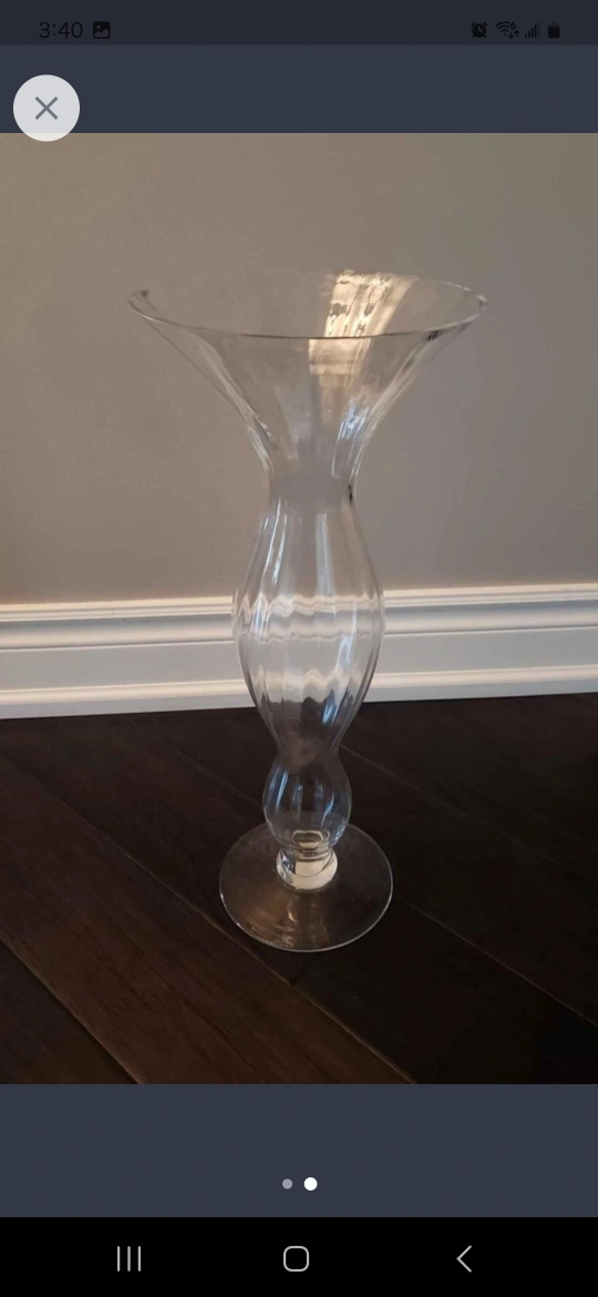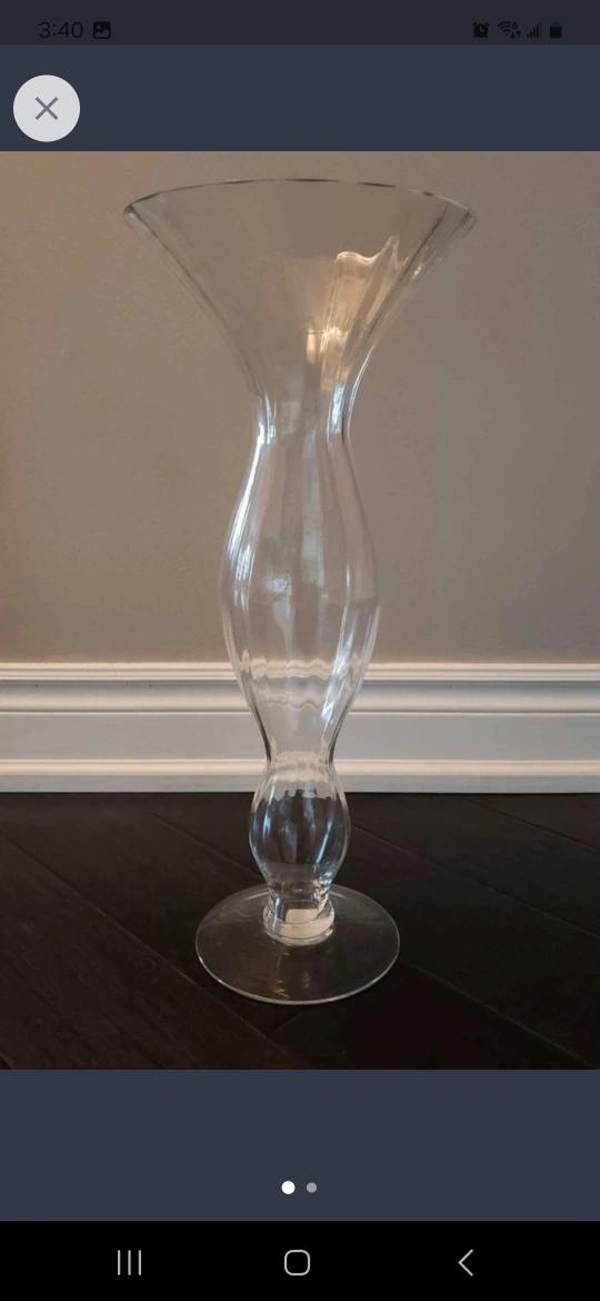 Selling a tall clear glass vase. It would be perfect for displaying flowers or as a decorative piece in your home. It is made of clear glass.