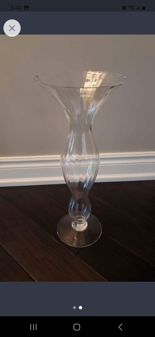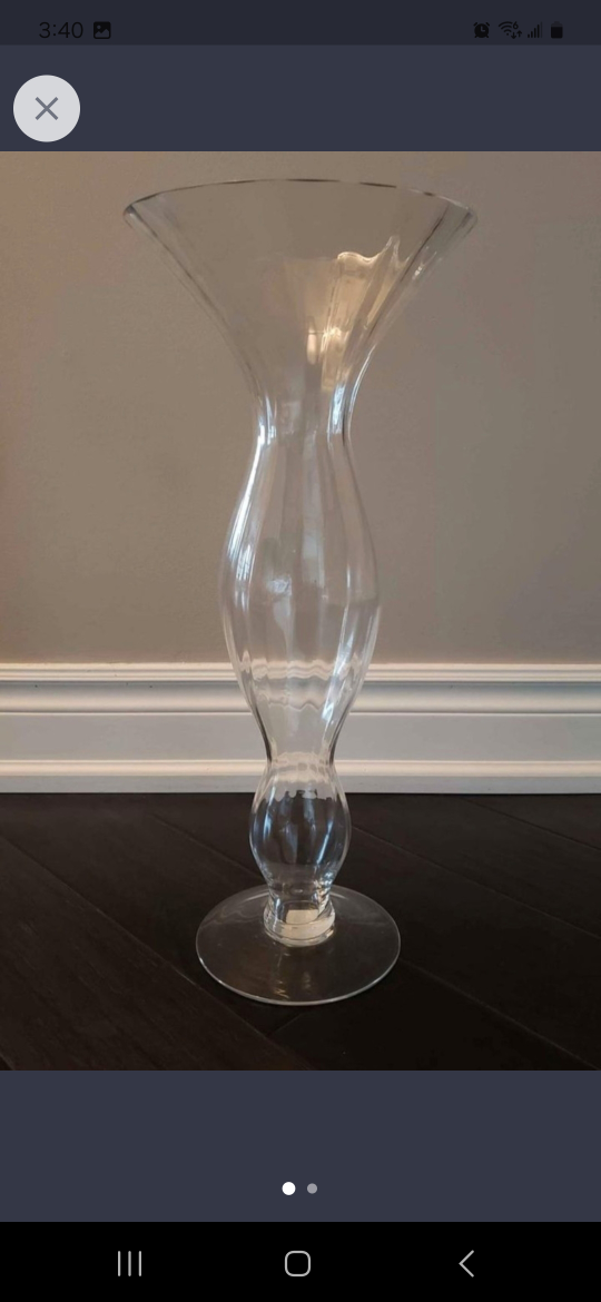 Selling a tall clear glass vase. It would be perfect for displaying flowers or as a decorative piece in your home. It is made of clear glass.