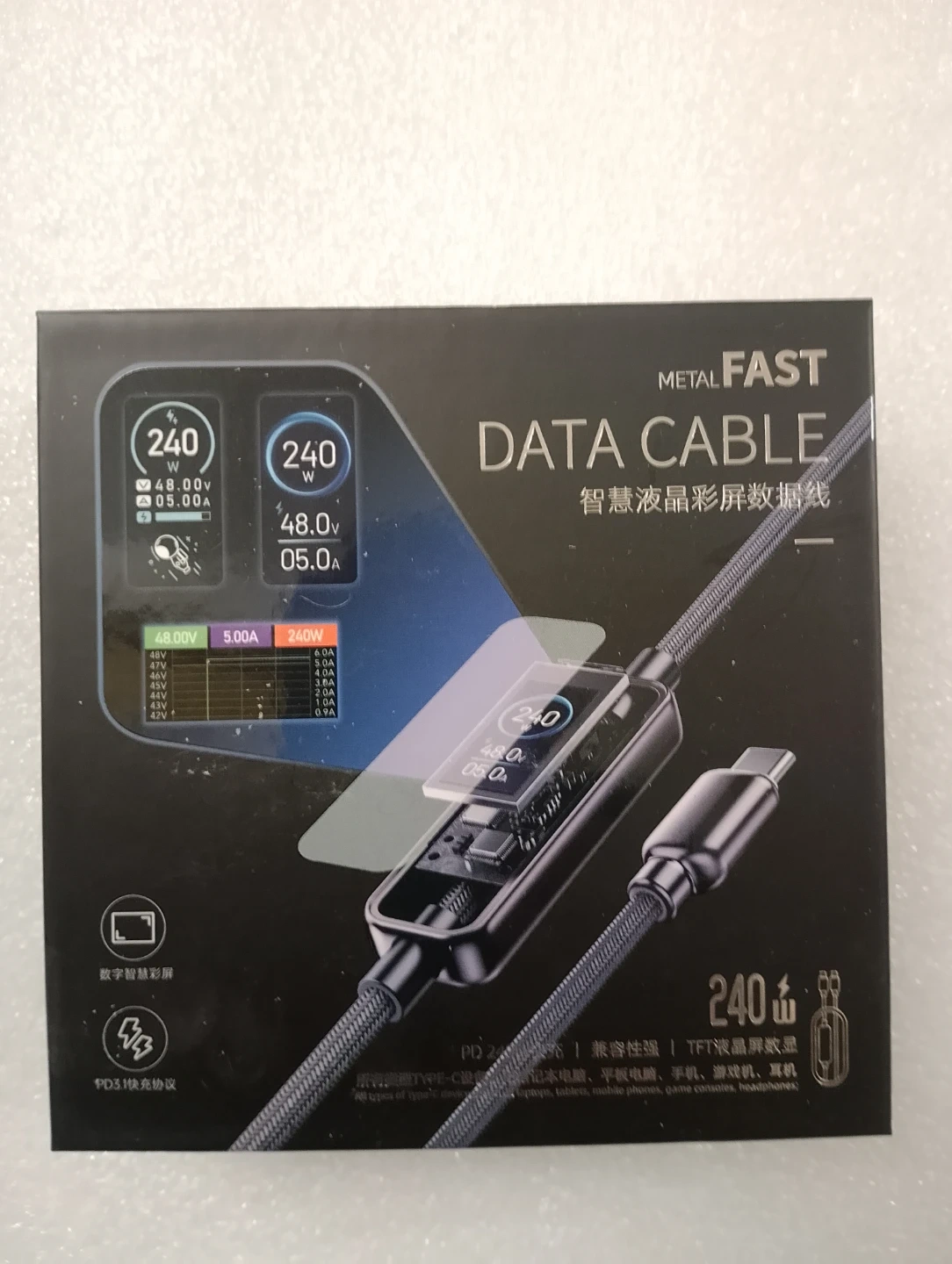 METALFAST USB-C data cable with a digital display. It supports 240W charging and PD3.1 fast charging protocol. It's compatible with laptops, tablets, and mobile phones.