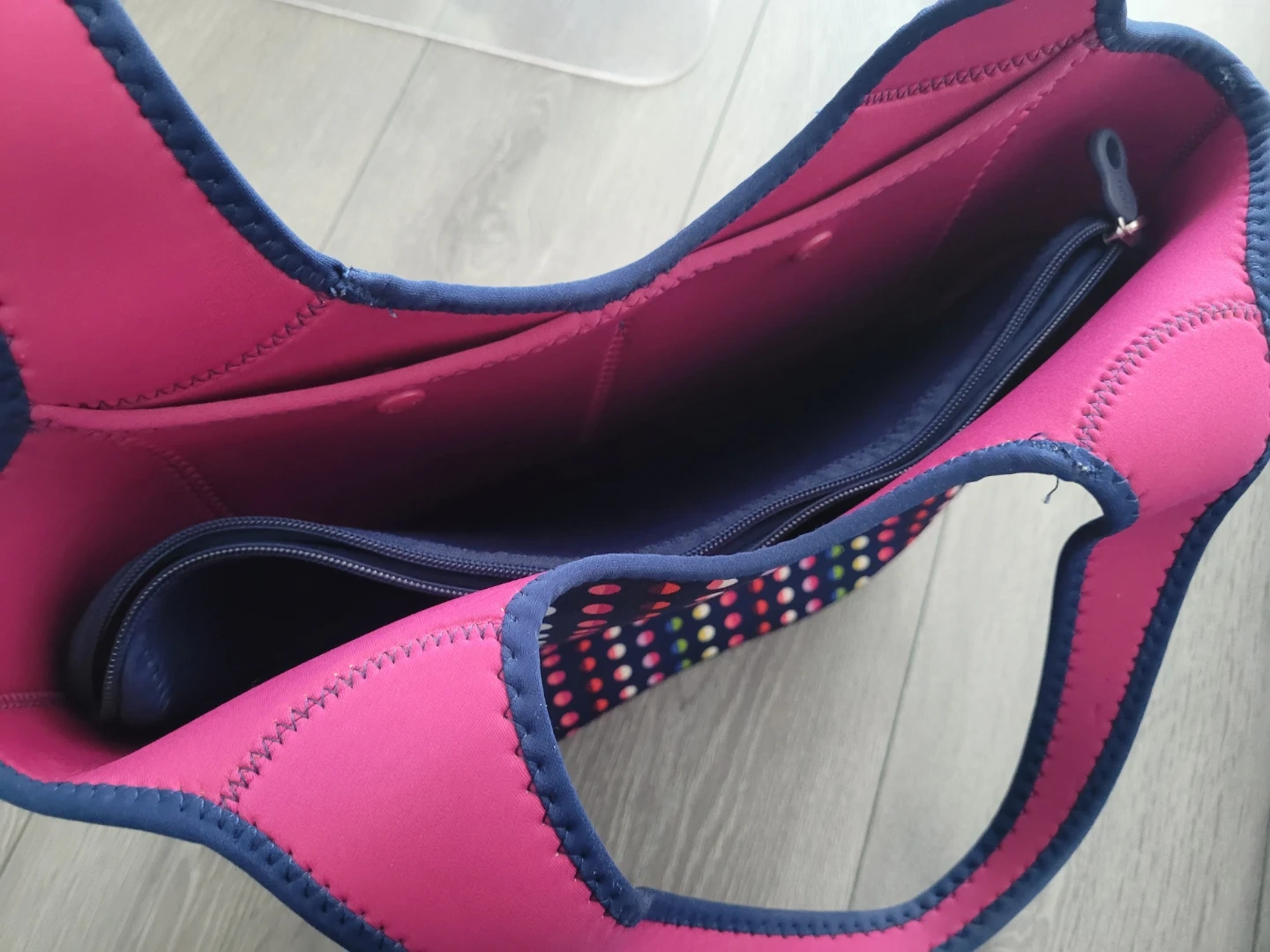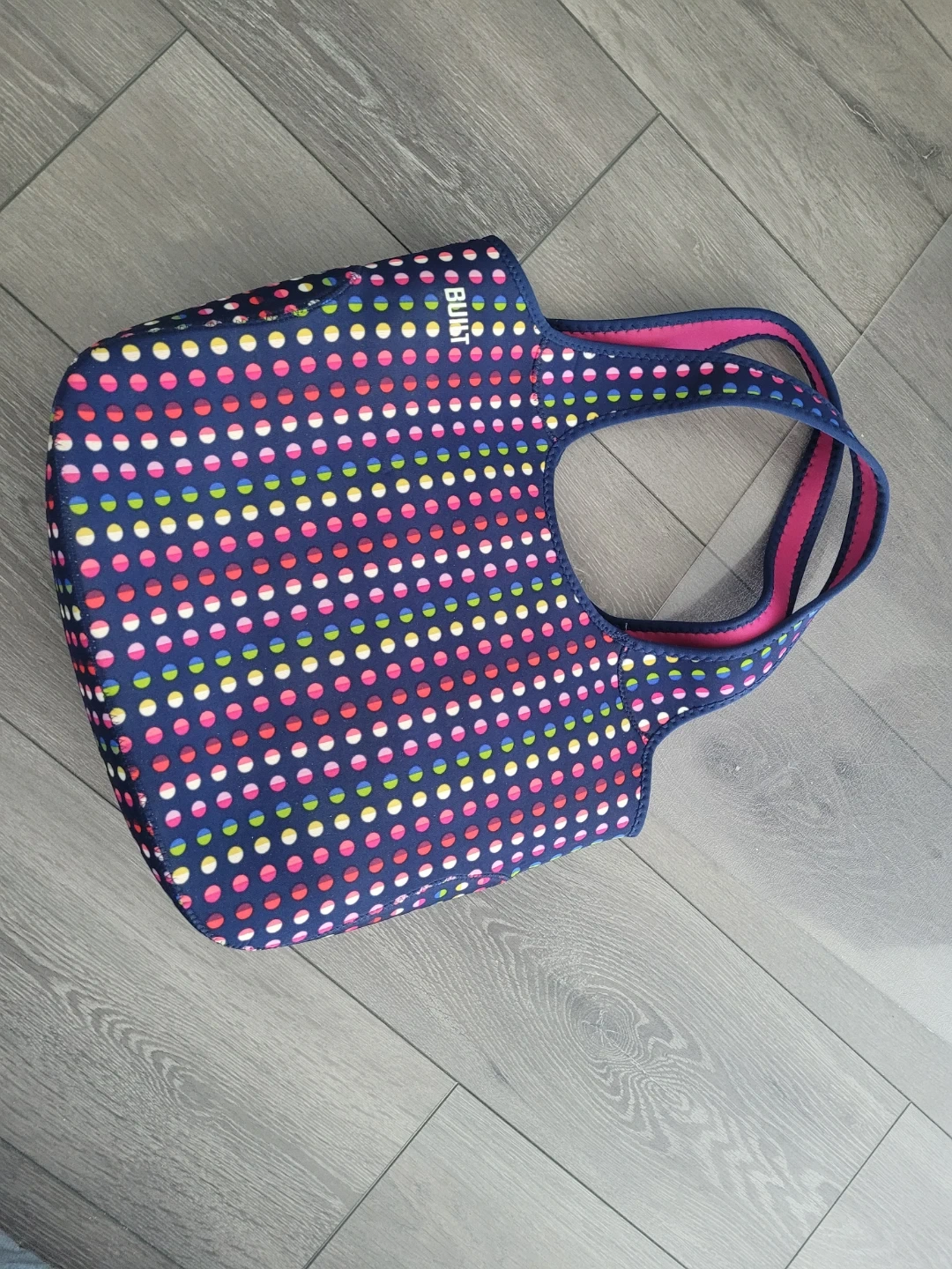 A BUILT NY neoprene tote bag with a colourful polka dot pattern. It's navy blue with pink trim and handles. Inside, it has pockets and a zippered compartment.