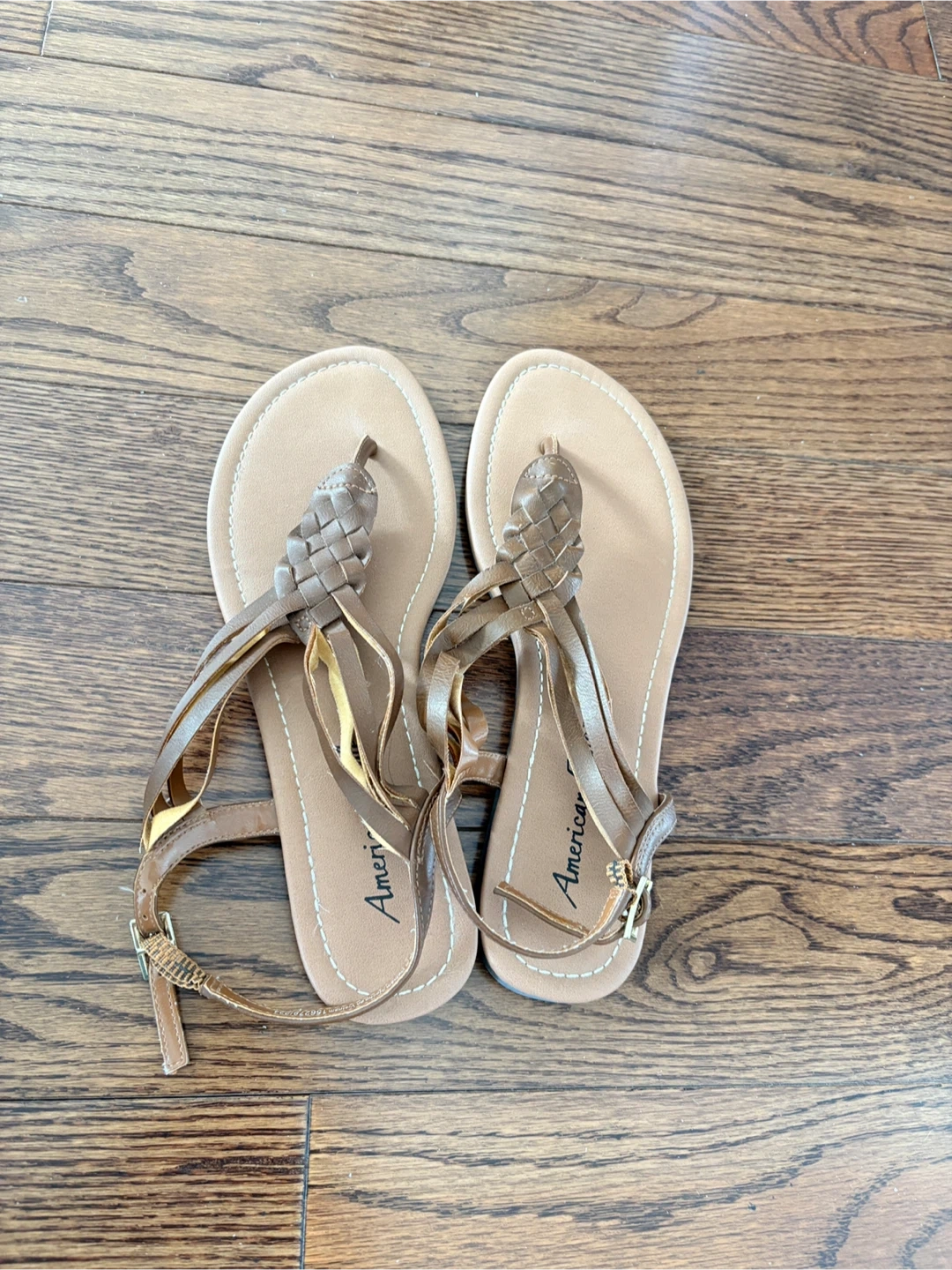 Comfortable brown woven strap sandals from American Eagle. These flat sandals feature a classic thong strap with braided detailing. Size is 8.